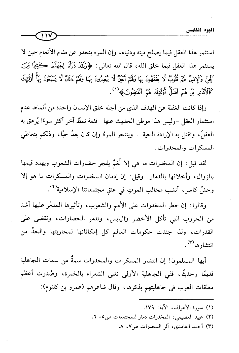 أيها المسلمون! إن انتشار المسكرات والمخدرات سمةٌ من سمات الجاهلية قديمًا وحديثًا، ففي الجاهلية الأولى تغنى الشعراء بالخمرة، وصُدرت أعظم معلقات العرب في جاهليتهم بذكرها، وقال شاعرهم (عمرو بن كلثوم):