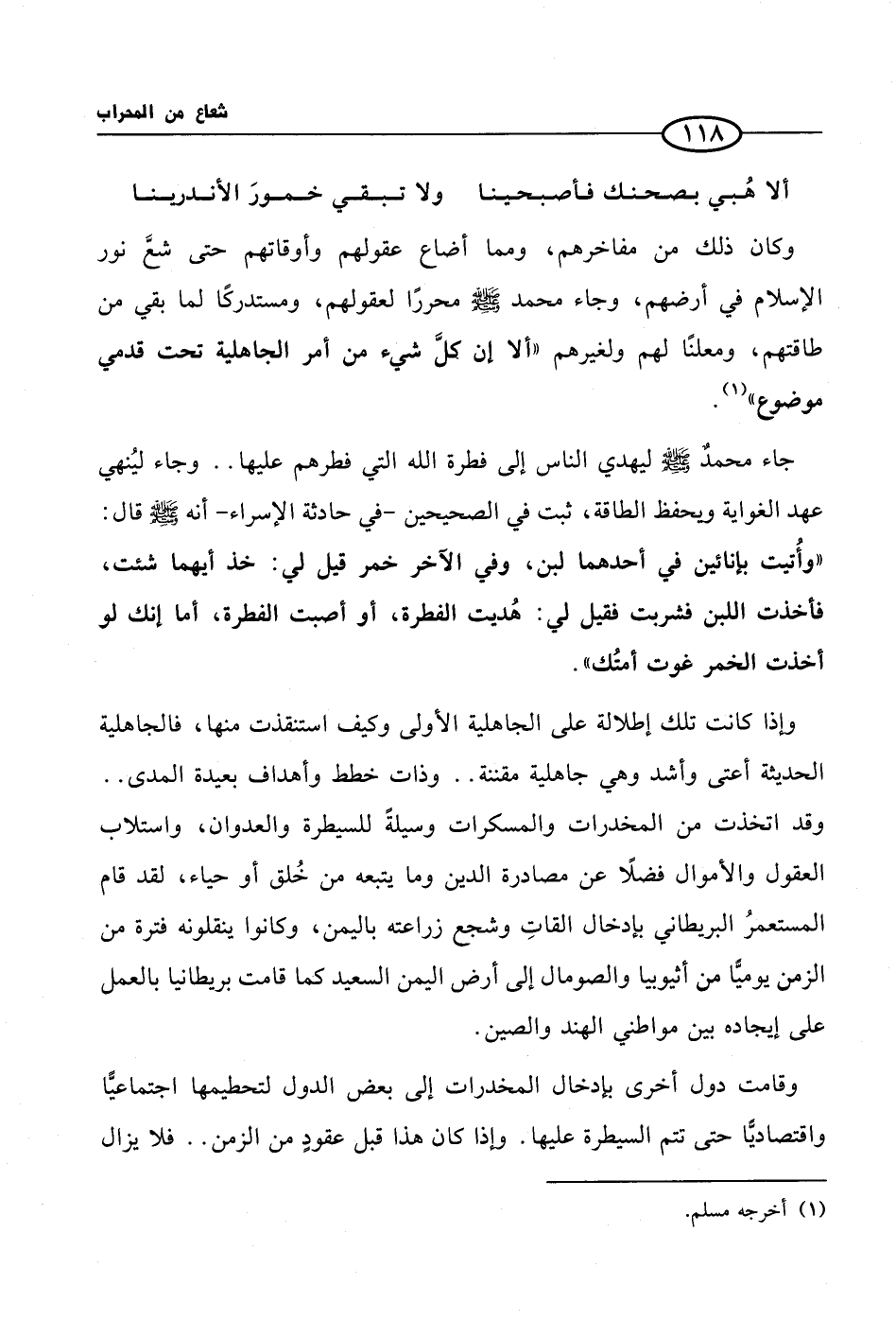 وكان ذلك من مفاخرهم، ومما أضاع عقولهم وأوقاتهم حتى شعَّ نور الإسلام في أرضهم، وجاء محمد صلى الله عليه وسلم محررًا لعقولهم، ومستدركًا لما بقي من طاقتهم، ومعلنًا لهم ولغيرهم «ألا إن كلَّ شيء من أمر الجاهلية تحت قدمي موضوع» (¬1).