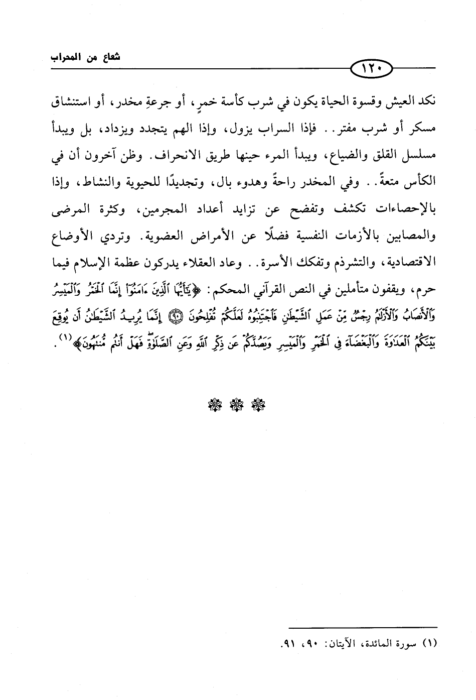 نكد العيش وقسوة الحياة يكون في شرب كأسة خمرٍ، أو جرعةِ مخدر، أو استنشاق مسكر أو شرب مفتر .. فإذا السراب يزول، وإذا الهم يتجدد ويزداد، بل ويبدأ مسلسل القلق والضياع، ويبدأ المرء حينها طريق الانحراف. وظن آخرون أن في الكأس متعةً .. وفي المخدر راحةً وهدوء بال، وتجديدًا للحيوية والنشاط، وإذا بالإحصاءات تكشف وتفضح عن تزايد أعداد المجرمين، وكثرة المرضى والمصابين بالأزمات النفسية فضلًا عن الأمراض العضوية. وتردي الأوضاع الاقتصادية، والتشرذم وتفكك الأسرة .. وعاد العقلاء يدركون عظمة الإسلام فيما حرم، ويقفون متأملين في النص القرآني المحكم: {يا أيها الذين آمنوا إنما الخمر والميسر والأنصاب والأزلام رجس من عمل الشيطان فاجتنبوه لعلكم تفلحون * إنما يريد الشيطان أن يوقع بينكم العداوة والبغضاء في الخمر والميسر ويصدكم عن ذكر الله وعن الصلاة فهل أنتم منتهون} (¬1).