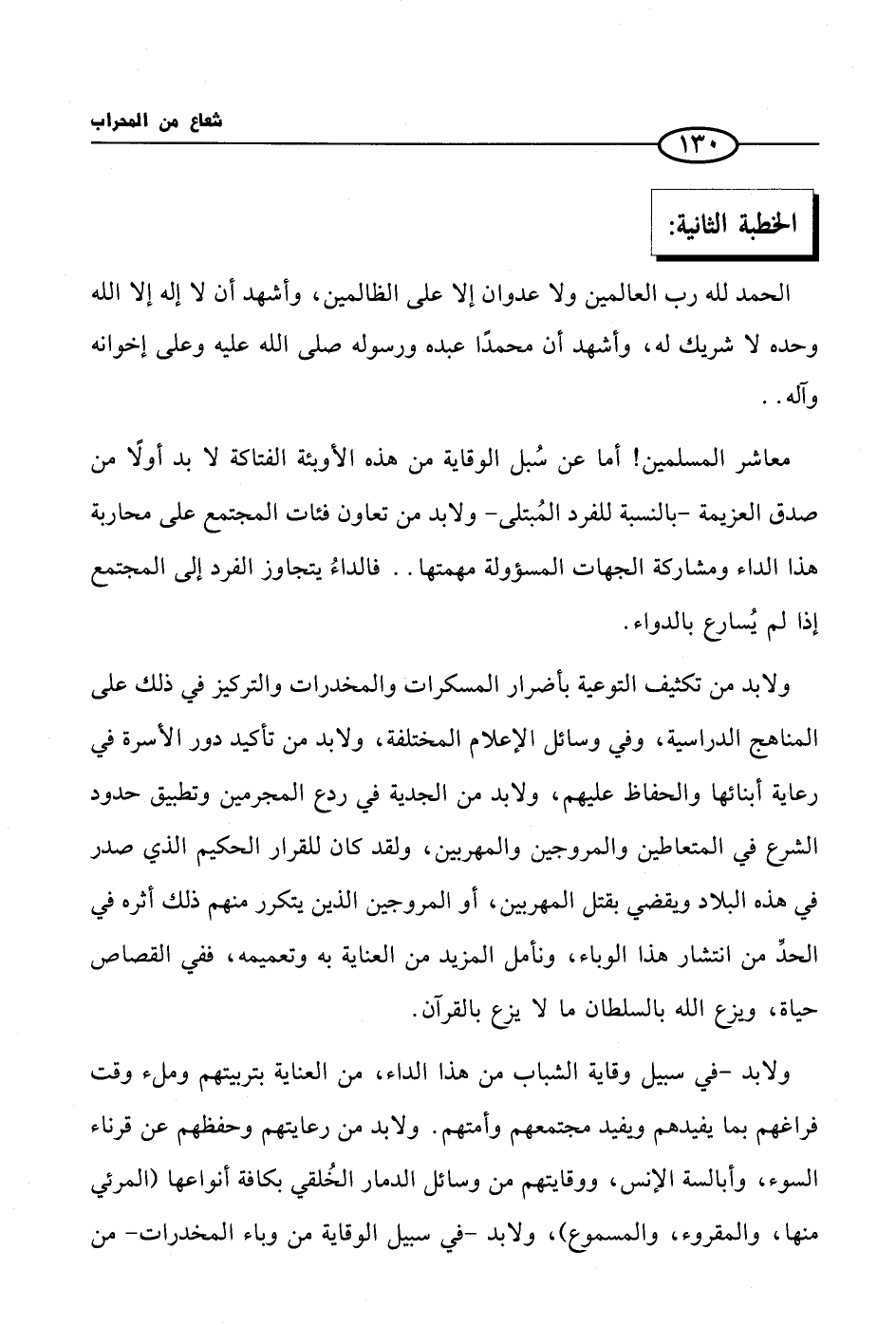ولابد من تكثيف التوعية بأضرار المسكرات والمخدرات والتركيز في ذلك على المناهج الدراسية، وفي وسائل الإعلام المختلفة، ولابد من تأكيد دور الأسرة في رعاية أبنائها والحفاظ عليهم، ولابد من الجدية في ردع المجرمين وتطبيق حدود الشرع في المتعاطين والمروجين والمهربين، ولقد كان للقرار الحكيم الذي صدر في هذه البلاد ويقضي بقتل المهربين، أو المروجين الذين يتكرر منهم ذلك أثره في الحدِّ من انتشار هذا الوباء، ونأمل المزيد من العناية به وتعميمه، ففي القصاص حياة، ويزع الله بالسلطان ما لا يزع بالقرآن.