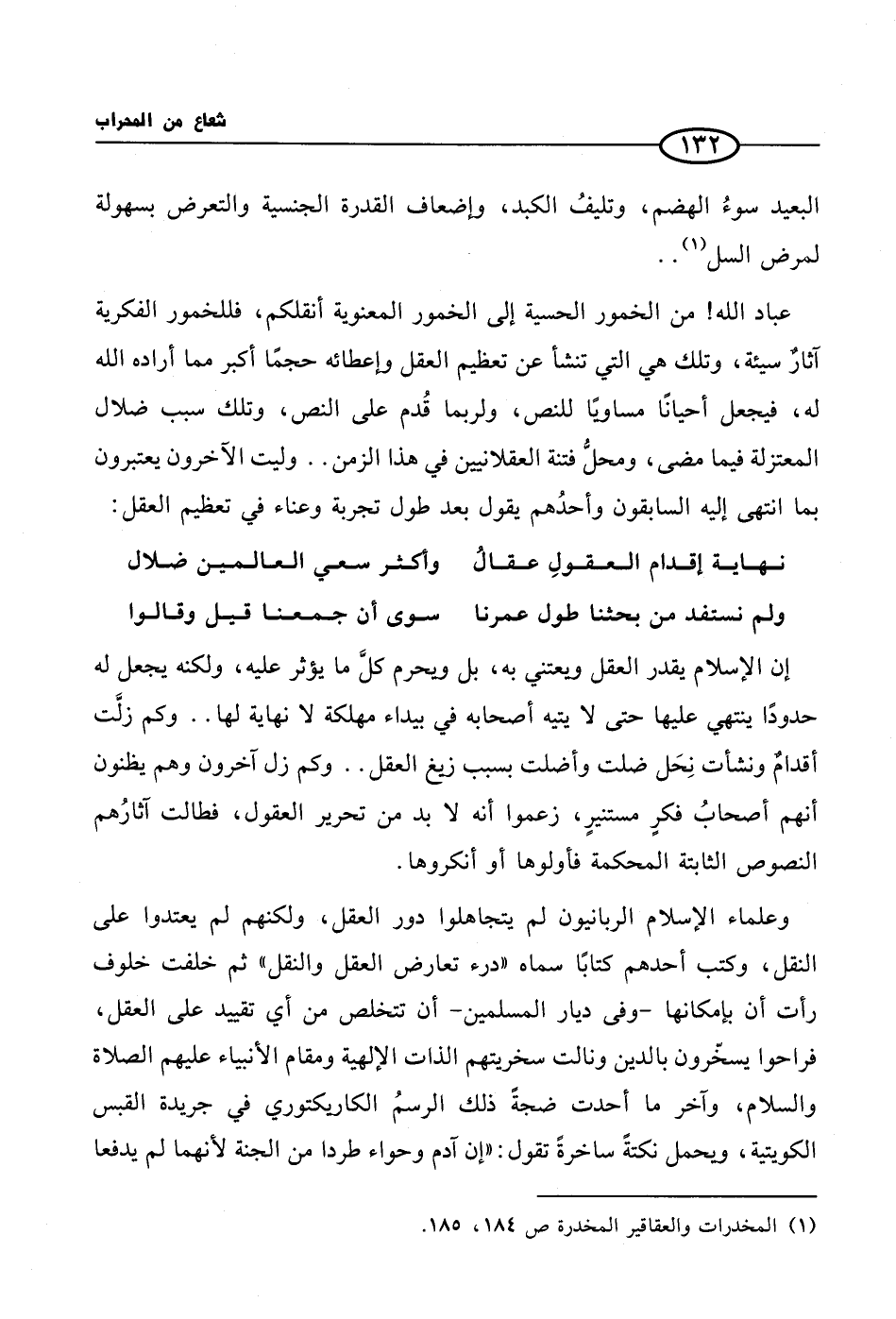عباد الله! من الخمور الحسية إلى الخمور المعنوية أنقلكم، فللخمور الفكرية آثارٌ سيئة، وتلك هي التي تنشأ عن تعظيم العقل وإعطائه حجمًا أكبر مما أراده الله له، فيجعل أحيانًا مساويًا للنص، ولربما قُدم على النص، وذلك سبب ضلال المعتزلة فيما مضى، ومحلُّ فتنة العقلانيين في هذا الزمن .. وليت الآخرون يعتبرون بما انتهى إليه السابقون وأحدُهم يقول بعد طول تجربة وعناء في تعظيم العقل: