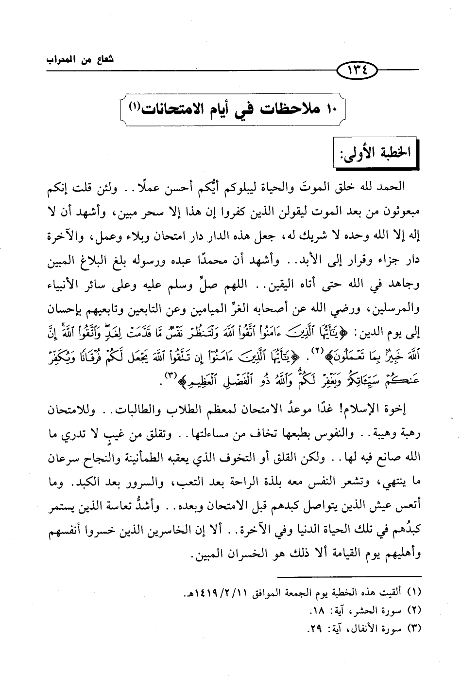إخوة الإسلام! غدًا موعدُ الامتحان لمعظم الطلاب والطالبات .. وللامتحان رهبة وهيبة .. والنفوس بطبعها تخاف من مساءلتها .. وتقلق من غيبٍ لا تدري ما الله صانع فيه لها .. ولكن القلق أو التخوف الذي يعقبه الطمأنينة والنجاح سرعان ما ينتهي، وتشعر النفس معه بلذة الراحة بعد التعب، والسرور بعد الكبد. وما أتعس عيش الذين يتواصل كبدهم قبل الامتحان وبعده .. وأشدُّ تعاسة الذين يستمر كبدُهم في تلك الحياة الدنيا وفي الآخرة .. ألا إن الخاسرين الذين خسروا أنفسهم وأهليهم يوم القيامة ألا ذلك هو الخسران المبين.