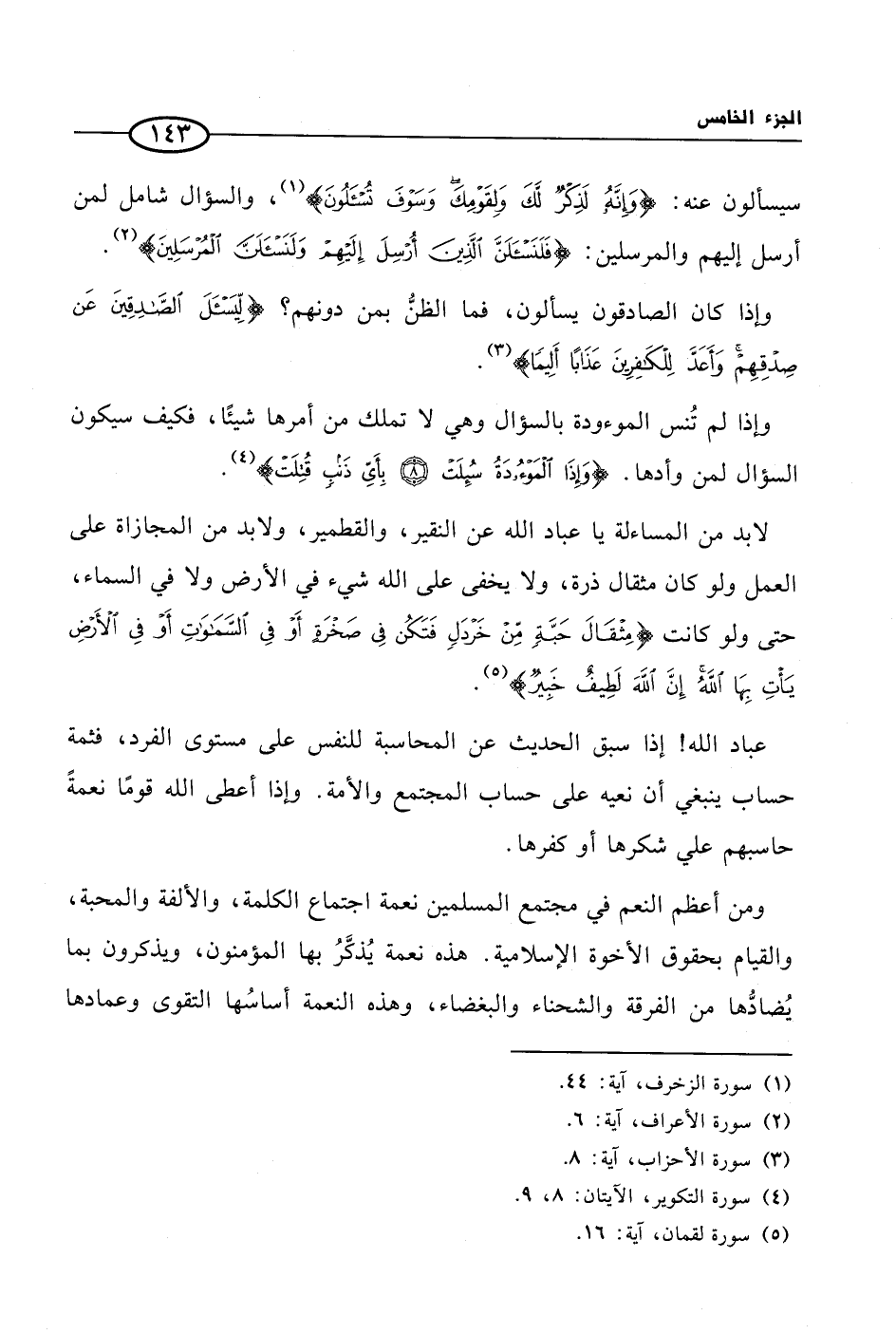 لابد من المساءلة يا عباد الله عن النقير، والقطمير، ولابد من المجازاة على العمل ولو كان مثقال ذرة، ولا يخفى على الله شيء في الأرض ولا في السماء، حتى ولو كانت {مثقال حبة من خردل فتكن في صخرة أو في السماوات أو في الأرض يأت بها الله إن الله لطيف خبير} (¬5).
