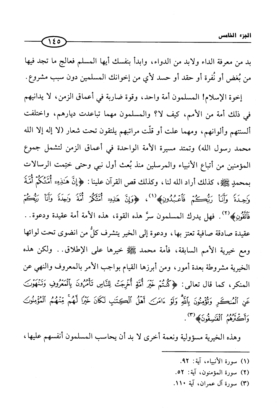 فهل يدرك المسلمون سرَّ هذه القوة، هذه الأمة أمة عقيدة ودعوة .. عقيدة صادقة صافية تعتز بها، ودعوة إلى الخير يتشرف كلُّ من انضوى تحت لوائها ومع خيرية الأمم السابقة، فأمة محمد صلى الله عليه وسلم خيرها على الإطلاق .. ولكن هذه الخيرية مشروطة بعدة أمور، ومن أبرزها القيام بواجب الأمر بالمعروف والنهي عن المنكر، كما قال تعالى: {كنتم خير أمة أخرجت للناس تأمرون بالمعروف وتنهون عن المنكر وتؤمنون بالله ولو آمن أهل الكتاب لكان خيرا لهم منهم المؤمنون وأكثرهم الفاسقون} (¬3).