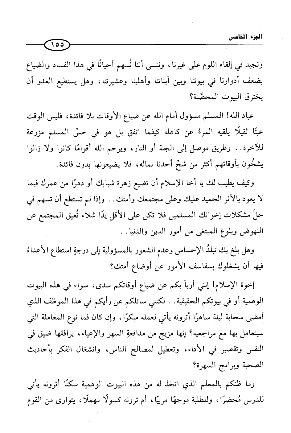 وهل بلغ بك تبلدُ الإحساس وعدم الشعور بالمسؤولية إلى درجةٍ استطاع الأعداءُ فيها أن يشغلوك بسفاسف الأمور عن أوضاع أمتك؟ إخوة الإسلام! إنني أربأ بكم عن ضياع أوقاتكم سدى، سواء في هذه البيوت الوهمية أو في بيوتكم الحقيقية .. لكنني سائلكم عن رأيكم في هذا الموظف الذي أمضى سحابة ليلة ساهرًا أترونه يأتي لعمله مبكرًا، وإن كان فما نوع المعاملة التي سيتعامل بها مع مراجعيه؟ إنها مزيج من مدافعةِ السهر والإعياء، يرافقها ضيق في النفس وتقصير في الأداء، وتعطيل لمصالح الناس، وانشغال الفكر بأحاديث الصحبة وبرامج السهرة؟