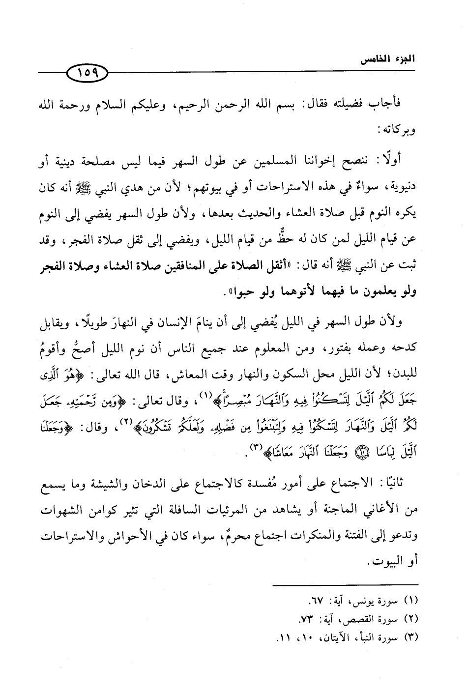 ولأن طول السهر في الليل يُفضي إلى أن ينامَ الإنسان في النهارَ طويلًا، ويقابل كدحه وعمله بفتور، ومن المعلوم عند جميع الناس أن نوم الليل أصحُّ وأقومُ للبدن؛ لأن الليل محل السكون والنهار وقت المعاش، قال الله تعالى: {هُوَ الَّذِي جَعَلَ لَكُمُ اللَّيْلَ لِتَسْكُنُوا فِيهِ وَالنَّهَارَ مُبْصِرًا} (¬1)، وقال تعالى: {وَمِنْ رَحْمَتِهِ جَعَلَ لَكُمُ اللَّيْلَ وَالنَّهَارَ لِتَسْكُنُوا فِيهِ وَلِتَبْتَغُوا مِنْ فَضْلِهِ وَلَعَلَّكُمْ تَشْكُرُونَ} (¬2)، وقال: {وَجَعَلْنَا اللَّيْلَ لِبَاسًا * وَجَعَلْنَا النَّهَارَ مَعَاشًا} (¬3).