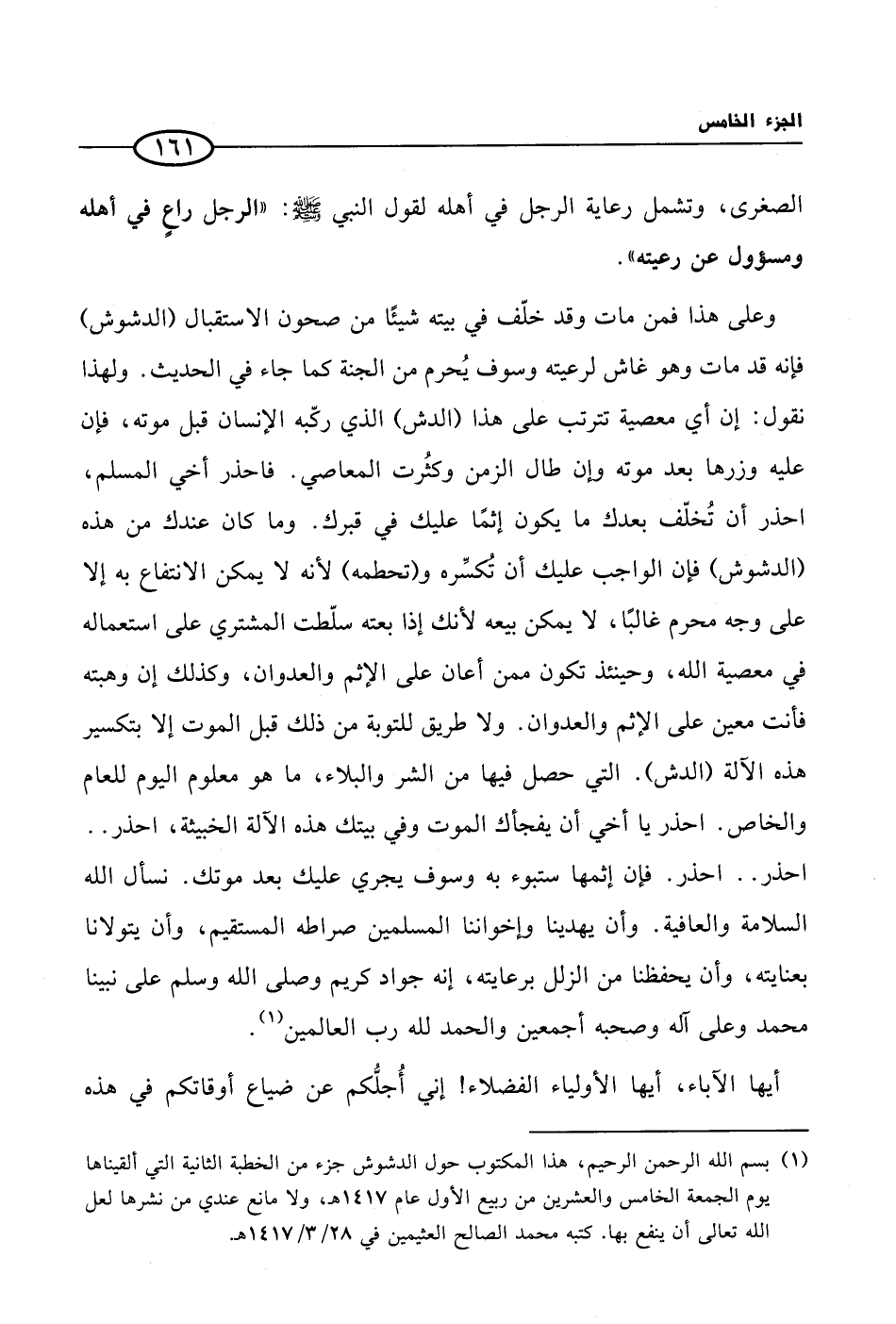 (¬1) بسم الله الرحمن الرحيم، هذا المكتوب حول الدشوش جزء من الخطبة الثانية التي ألقيناها يوم الجمعة الخامس والعشرين من ربيع الأول عام 1417 هـ، ولا مانع عندي من نشرها لعل الله تعالى أن ينفع بها. كتبه محمد الصالح العثيمين في 28/ 3/ 1417 هـ.