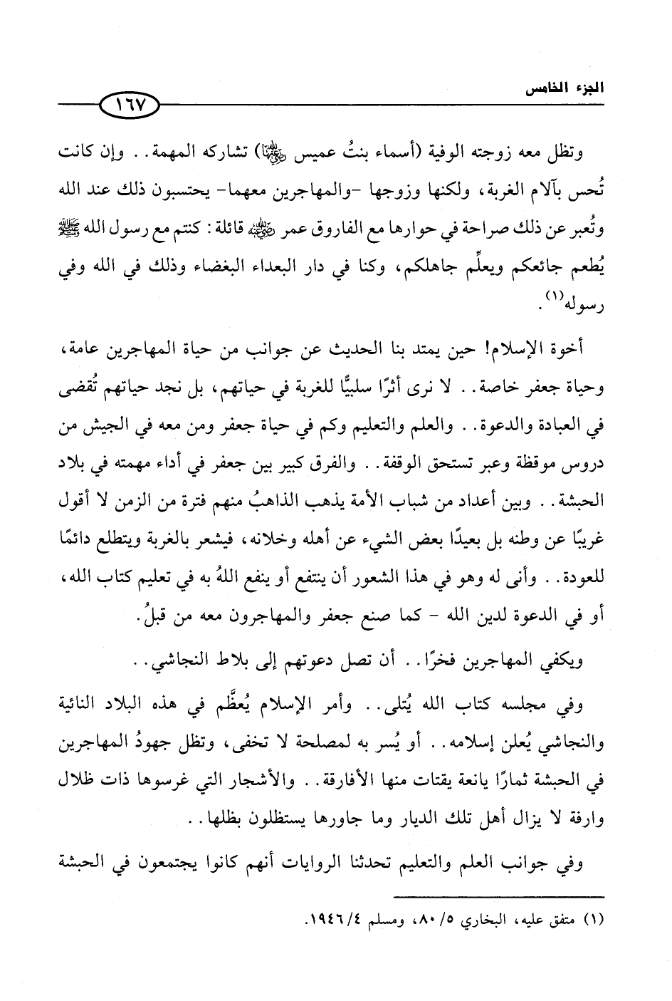 وفي مجلسه كتاب الله يُتلى .. وأمر الإسلام يُعظَّم في هذه البلاد النائية والنجاشي يُعلن إسلامه .. أو يُسر به لمصلحة لا تخفى، وتظل جهودُ المهاجرين في الحبشة ثمارًا يانعة يقتات منها الأفارقة .. والأشجار التي غرسوها ذات ظلال وارفة لا يزال أهل تلك الديار وما جاورها يستظلون بظلها ..