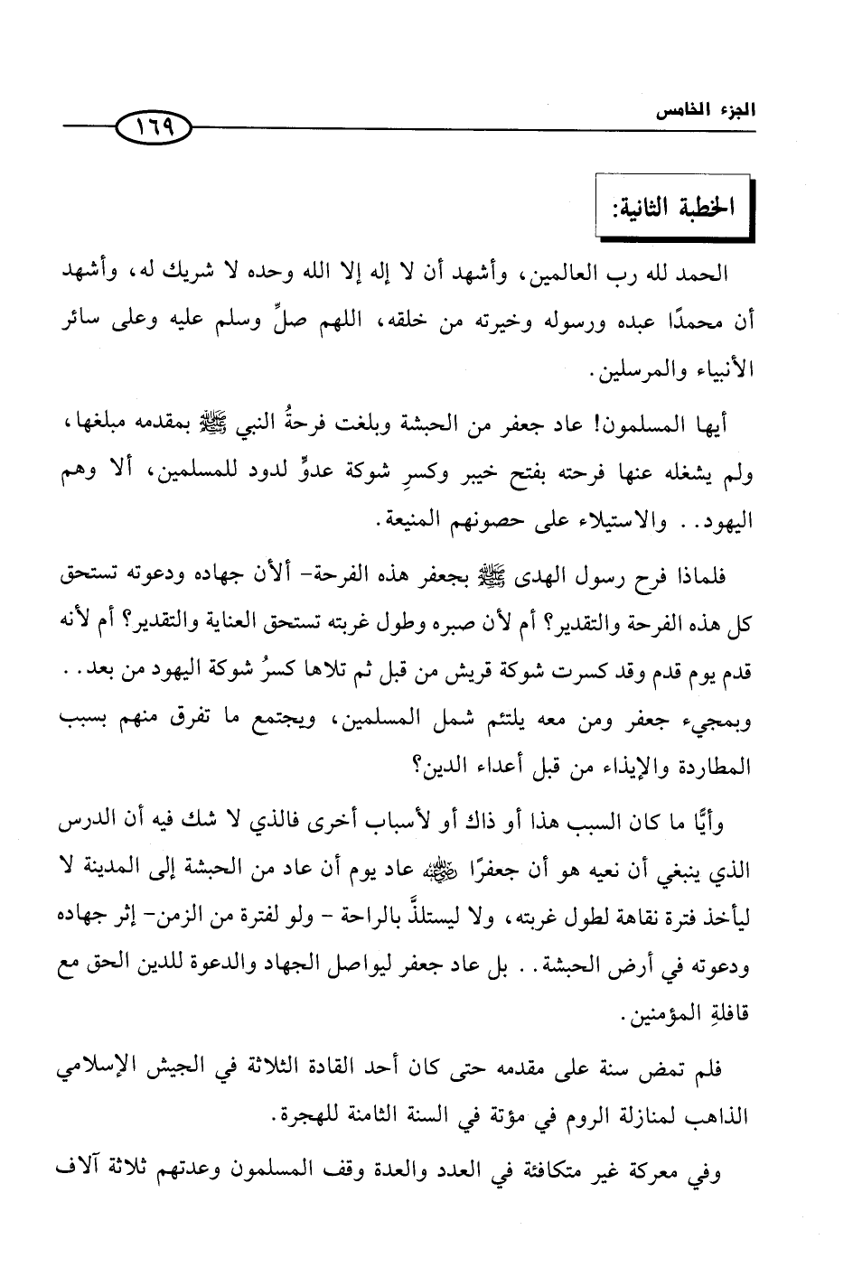 وأيًّا ما كان السبب هذا أو ذاك أو لأسباب أخرى فالذي لا شك فيه أن الدرس الذي ينبغي أن نعيه هو أن جعفرًا -رضي الله عنه- عاد يوم أن عاد من الحبشة إلى المدينة لا ليأخذ فترة نقاهة لطول غربته، ولا ليستلذَّ بالراحة - ولو لفترة من الزمن- إثر جهاده ودعوته في أرض الحبشة .. بل عاد جعفر ليواصل الجهاد والدعوة للدين الحق مع قافلةِ المؤمنين.