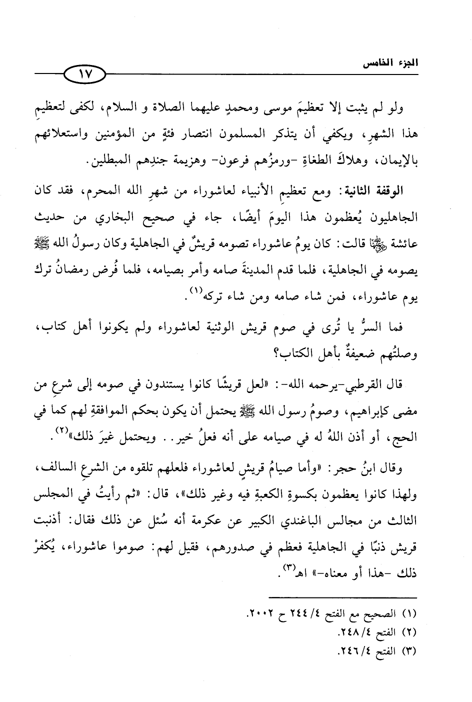 وقال ابنُ حجر: وأما صيامُ قريشٍ لعاشوراء فلعلهم تلقوه من الشرعِ السالف، ولهذا كانوا يعظمون بكسوةِ الكعبةِ فيه وغير ذلك، قال: ثم رأيتُ في المجلس الثالث من مجالس الباغندي الكبير عن عكرمة أنه سُئل عن ذلك فقال: أذنبت قريش ذنبًا في الجاهلية فعظم في صدورهم، فقيل لهم: صوموا عاشوراء، يُكفرْ ذلك- هذا أو معناه- اهـ (¬3).