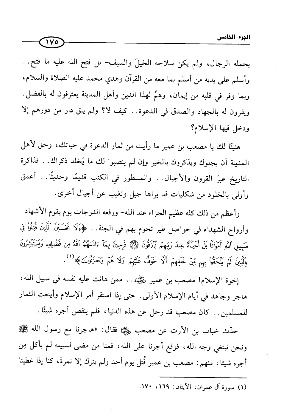 هنيئًا لك يا مصعب بن عمير ما رأيت من ثمار الدعوة في حياتك، وحق لأهل المدينة أن يجلوك ويذكروك بالخير وإن لم ينصبوا لك ما يُخلد ذكراك .. فذاكرة التاريخ عبرَ القرون والأجيال .. والمسطور في الكتب قديمًا وحديثًا .. أعمق وأولى بالخلود من شكليات قد يراها جيل وتغيب عن أجيال أخرى.
