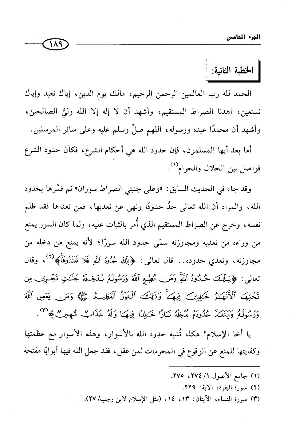 أما بعد أيها المسلمون، فإن حدود الله هي أحكام الشرع، فكأن حدود الشرع فواصل بين الحلال والحرام (¬1).
