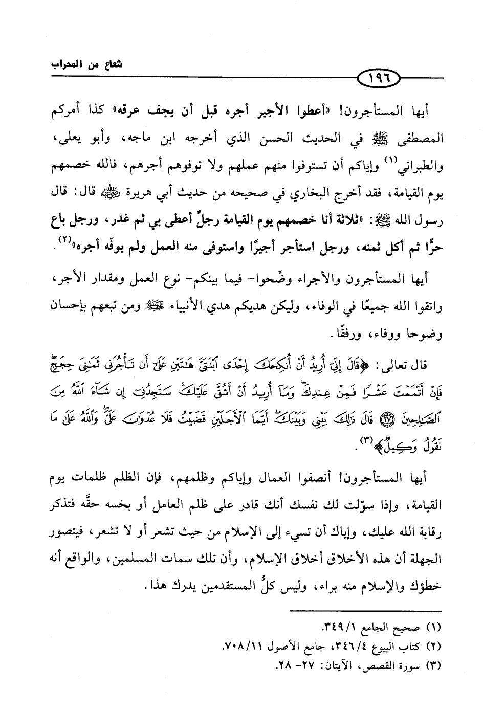 أيها المستأجرون! ((أعطوا الأجير أجره قبل أن يجف عرقه)) كذا أمركم المصطفى صلى الله عليه وسلم في الحديث الحسن الذي أخرجه ابن ماجه، وأبو يعلى، والطبراني (¬1) وإياكم أن تستوفوا منهم عملهم ولا توفوهم أجرهم، فالله خصمهم يوم القيامة، فقد أخرج البخاري في صحيحه من حديث أبي هريرة رضي الله عنه قال: قال رسول الله صلى الله عليه وسلم: ((ثلاثة أنا خصمهم يوم القيامة رجلٌ أعطى بي ثم غدر، ورجل باع حرًّا ثم أكل ثمنه، ورجل استأجر أجيرًا واستوفى منه العمل ولم يوفّه أجره)) (¬2).