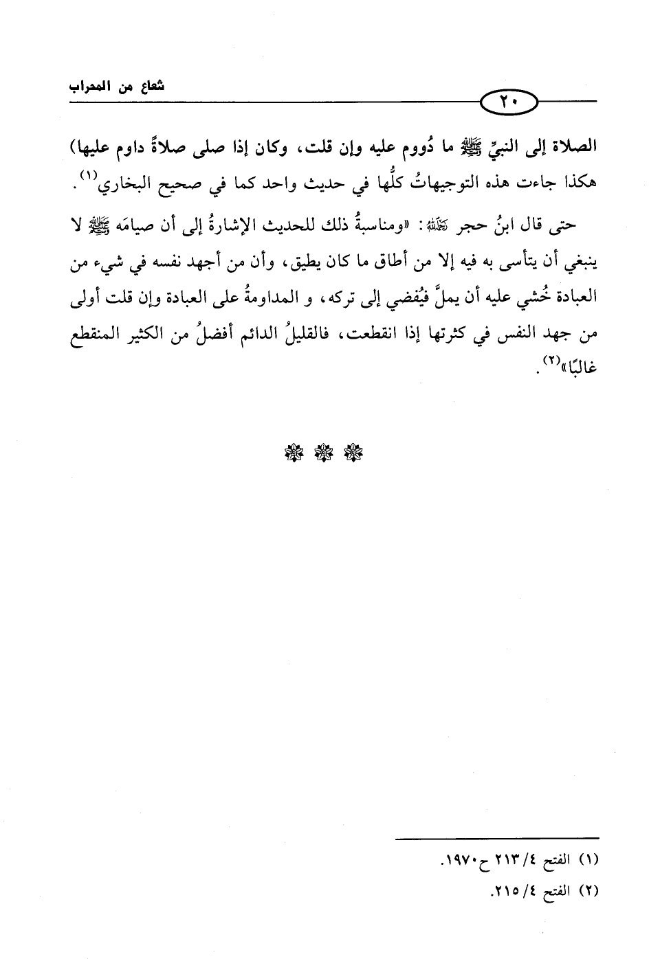 حتى قال ابنُ حجر رحمه الله: ومناسبةُ ذلك للحديث الإشارةُ إلى أن صيامَه صلى الله عليه وسلم لا ينبغي أن يتأسى به فيه إلا من أطاق ما كان يطيق، وأن من أجهد نفسه في شيء من العبادة خُشي عليه أن يملَّ فيُفضي إلى تركه، والمداومةُ على العبادة وإن قلت أولى من جهد النفس في كثرتها إذا انقطعت، فالقليلُ الدائم أفضلُ من الكثير المنقطع غالبًا (¬2).