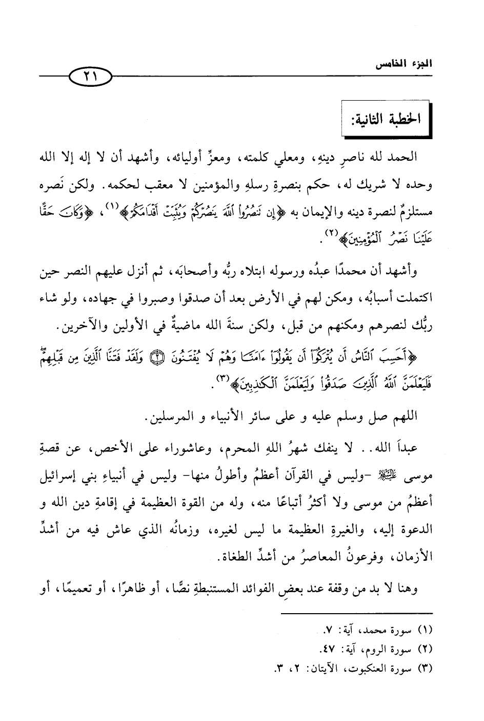 الحمد لله ناصرِ دينهِ، ومعلي كلمته، ومعزِّ أوليائه، وأشهد أن لا إله إلا الله وحده لا شريك له، حكم بنصرةِ رسلهِ والمؤمنين لا معقب لحكمه. ولكن نَصره مستلزمٌ لنصرة دينه والإيمان به {إن تنصروا الله ينصركم ويثبت أقدامكم} (¬1)، {وكان حقا علينا نصر المؤمنين} (¬2).