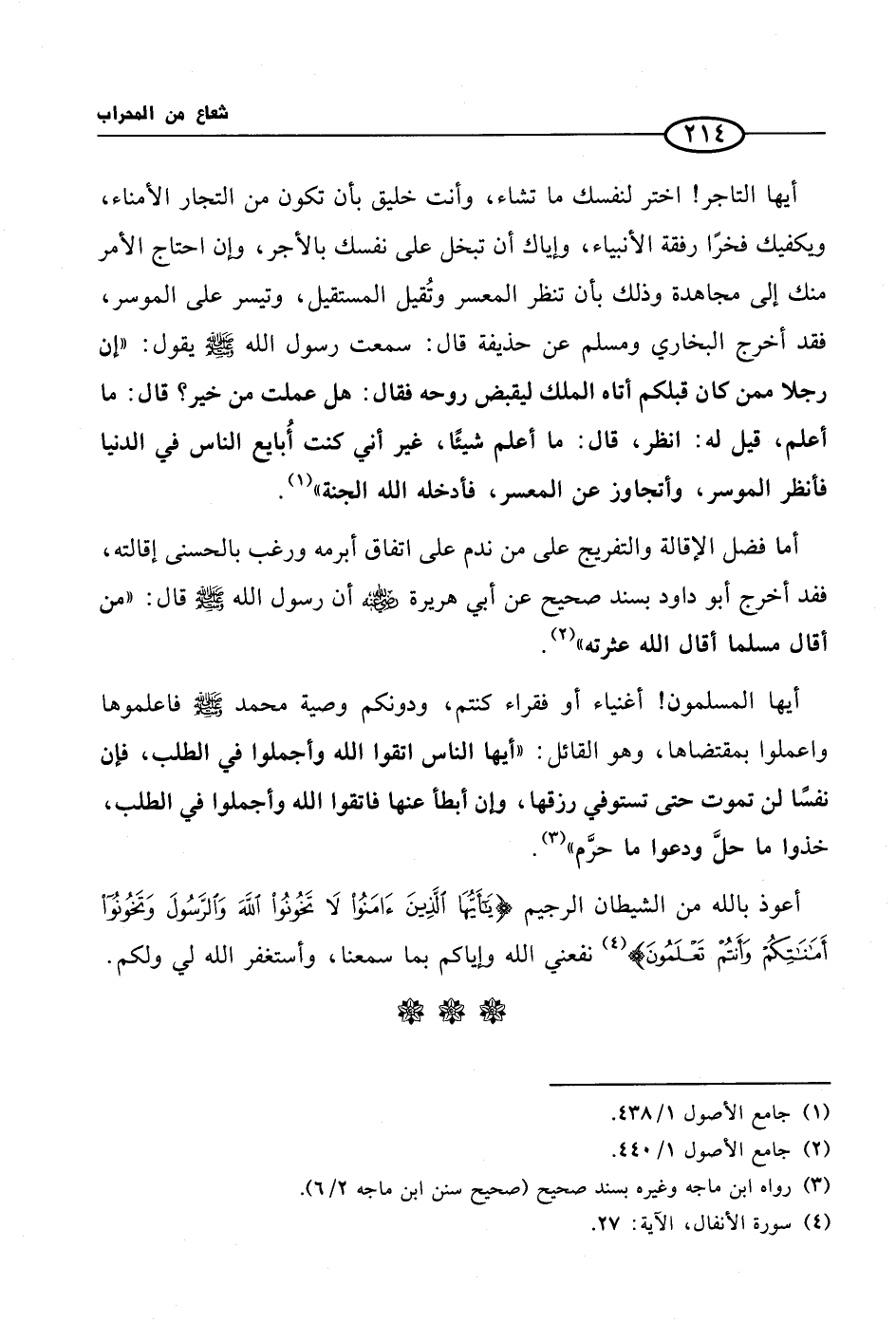 أيها المسلمون! أغنياء أو فقراء كنتم، ودونكم وصية محمد صلى الله عليه وسلم فاعلموها واعملوا بمقتضاها، وهو القائل: ((أيها الناس اتقوا الله وأجملوا في الطلب، فإن نفسًا لن تموت حتى تستوفي رزقها، وإن أبطأ عنها فاتقوا الله وأجملوا في الطلب، خذوا ما حلَّ ودعوا ما حرَّم)) (¬3).