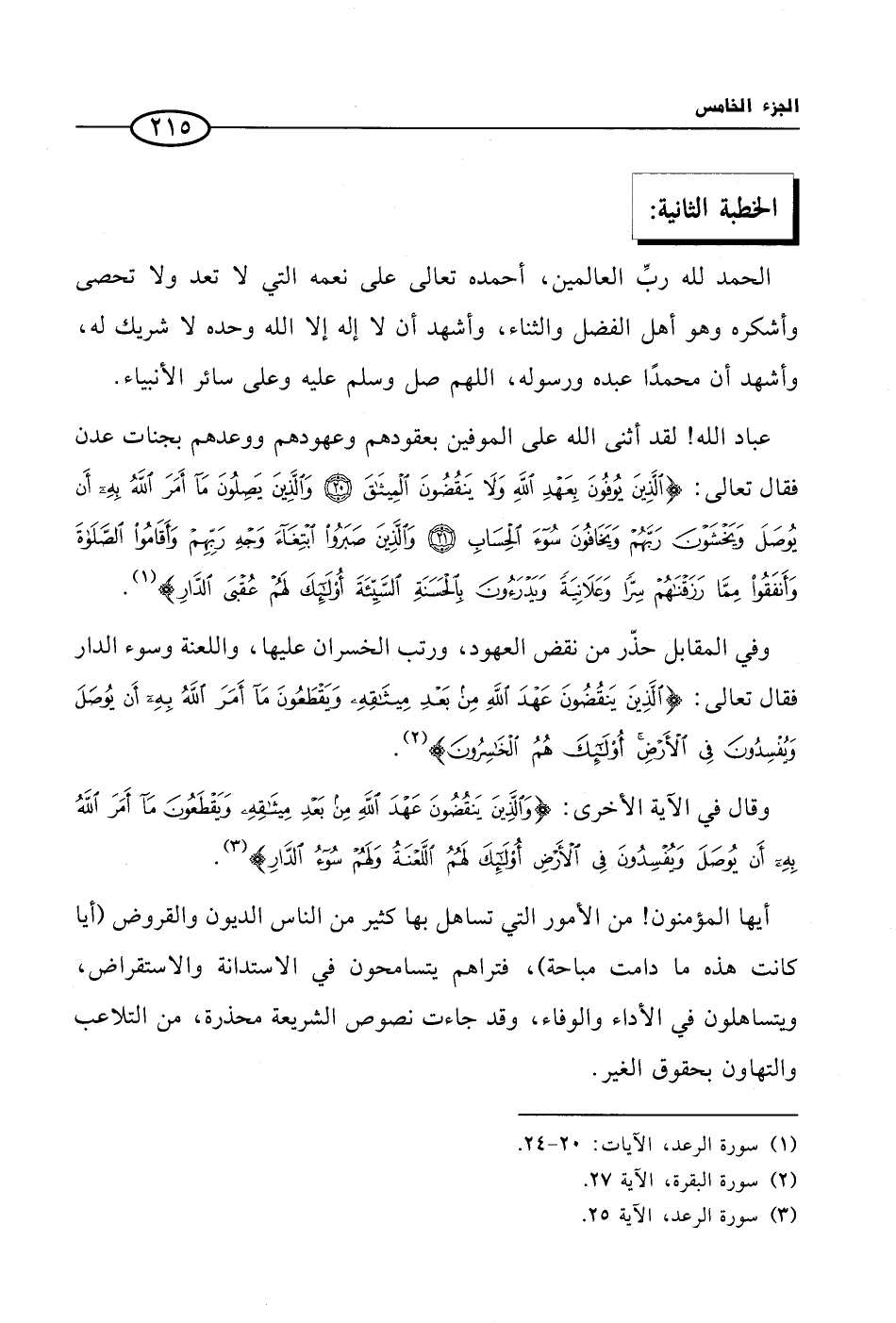 عباد الله! لقد أثنى الله على الموفين بعقودهم وعهودهم ووعدهم بجنات عدن فقال تعالى: {الذين يوفون بعهد الله ولا ينقضون الميثاق * والذين يصلون ما أمر الله به أن يوصل ويخشون ربهم ويخافون سوء الحساب * والذين صبروا ابتغاء وجه ربهم وأقاموا الصلاة وأنفقوا مما رزقناهم سرا وعلانية ويدرأون بالحسنة السيئة أولئك لهم عقبى الدار} (¬1).
