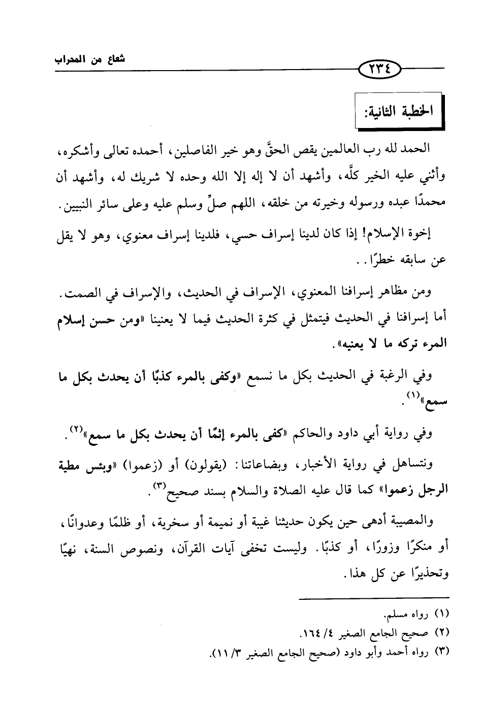 إخوة الإسلام! إذا كان لدينا إسراف حسي، فلدينا إسراف معنوي، وهو لا يقل عن سابقه خطرًا ..