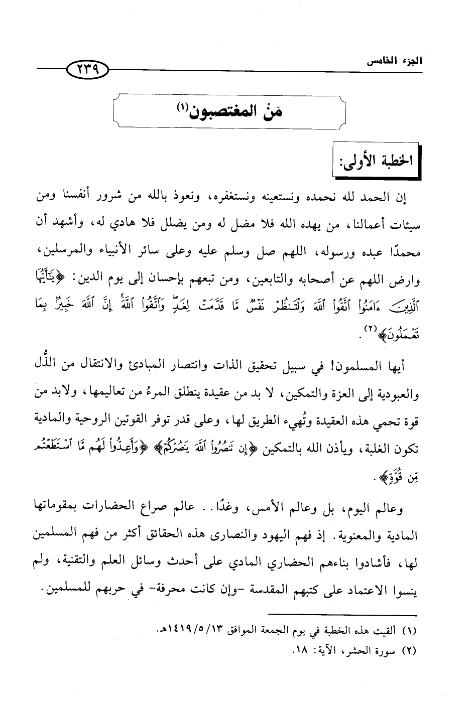(¬1) ألقيت هذه الخطبة في يوم الجمعة الموافق 13/ 5/ 1419 هـ.