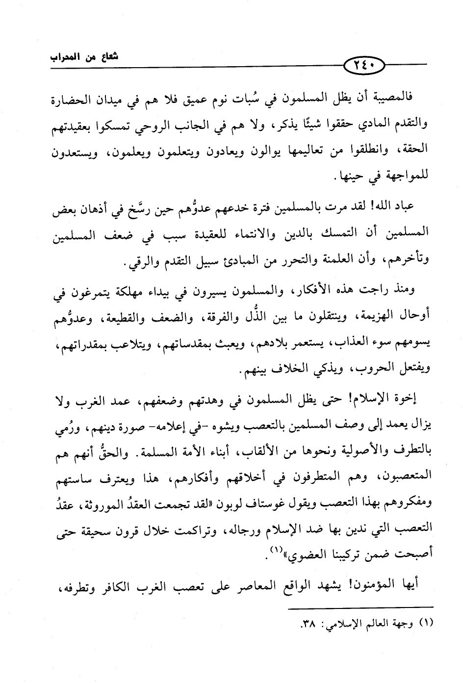 فالمصيبة أن يظل المسلمون في سُبات نوم عميق فلا هم في ميدان الحضارة والتقدم المادي حققوا شيئًا يذكر، ولا هم في الجانب الروحي تمسكوا بعقيدتهم الحقة، وانطلقوا من تعاليمها يوالون ويعادون ويتعلمون ويعلمون، ويستعدون للمواجهة في حينها.