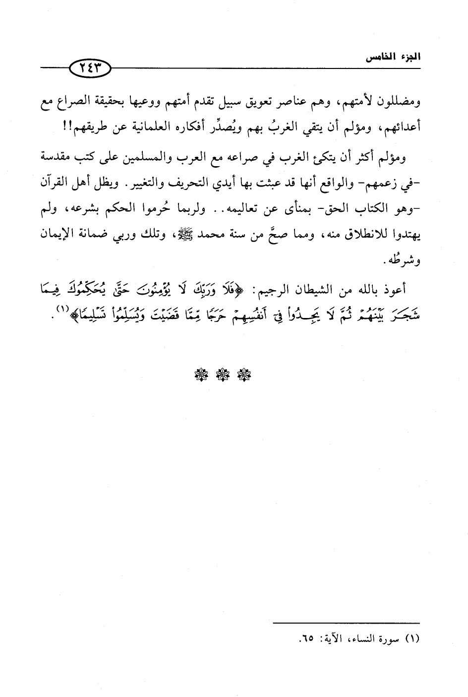 ومؤلم أكثر أن يتكئ الغرب في صراعه مع العرب والمسلمين على كتب مقدسة -في زعمهم- والواقع أنها قد عبثت بها أيدي التحريف والتغيير. ويظل أهل القرآن -وهو الكتاب الحق- بمنأى عن تعاليمه .. ولربما حُرموا الحكم بشرعه، ولم يهتدوا للانطلاق منه، ومما صحَّ من سنة محمد صلى الله عليه وسلم، وتلك وربي ضمانة الإيمان وشرطُه. أعوذ بالله من الشيطان الرجيم {فلا وربك لا يؤمنون حتى يحكموك فيما شجر بينهم ثم لا يجدوا في أنفسهم حرجا مما قضيت ويسلموا تسليما} (¬1)