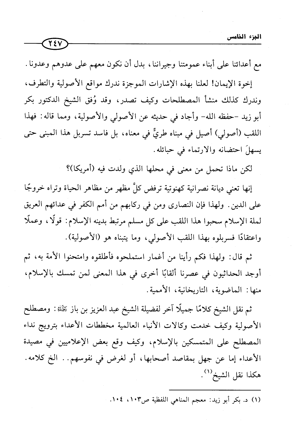 ثم قال: ولهذا فكم رأينا من أغمار استملحوه فأطلقوه وامتحنوا الأمة به، ثم أوجد الحداثيون في عصرنا ألقابًا أخرى في هذا المعنى لمن تمسك بالإسلام، منها: الماضوية، التاريخانية، الأممية. ثم نقل الشيخ كلامًا جميلًا آخر لفضيلة الشيخ عبد العزيز بن باز (رحمه الله): ومصطلح الأصولية وكيف خدمت وكالات الأنباء العالمية مخططات الأعداء بترويج نداء المصطلح على المتمسكين بالإسلام، وكيف وقع بعض الإعلاميين في مصيدة الأعداء إما عن جهل بمقاصد أصحابها، أو لغرض في نفوسهم .. الخ كلامه. هكذا نقل الشيخ (¬1).