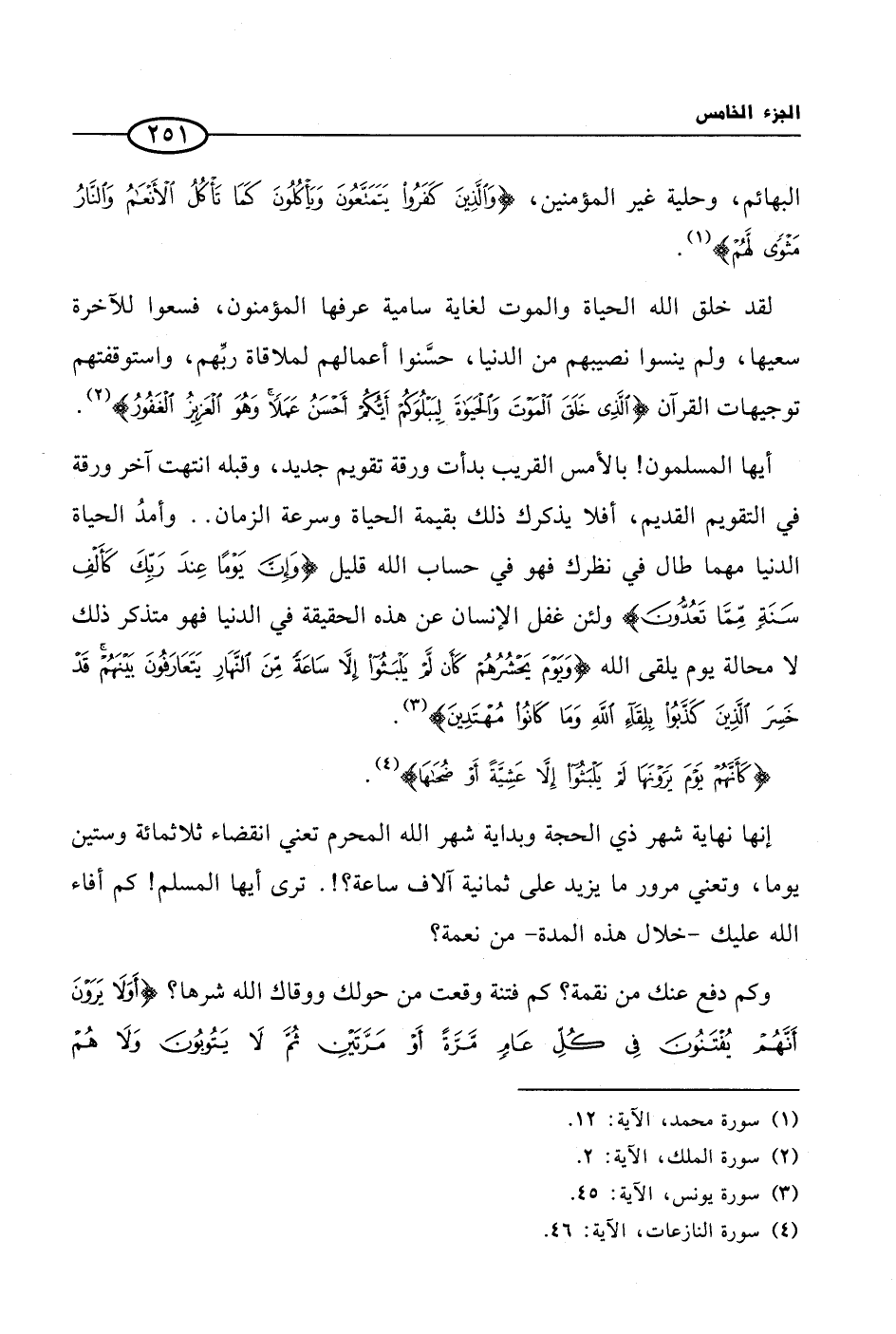 أيها المسلمون! بالأمس القريب بدأت ورقة تقويم جديد، وقبله انتهت آخر ورقة في التقويم القديم، أفلا يذكرك ذلك بقيمة الحياة وسرعة الزمان .. وأمدُ الحياة الدنيا مهما طال في نظرك فهو في حساب الله قليل {وإن يوما عند ربك كألف سنة مما تعدون} ولئن غفل الإنسان عن هذه الحقيقة في الدنيا فهو متذكر ذلك لا محالة يوم يلقى الله {ويوم يحشرهم كأن لم يلبثوا إلا ساعة من النهار يتعارفون بينهم قد خسر الذين كذبوا بلقاء الله وما كانوا مهتدين} (¬3).