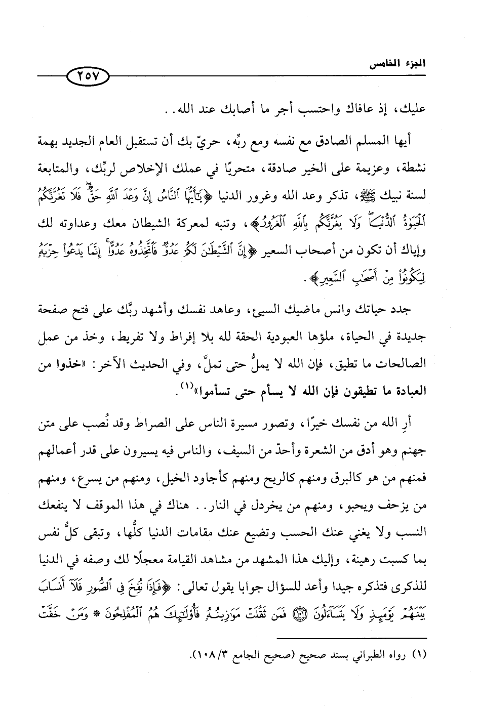 أيها المسلم الصادق مع نفسه ومع ربِّه، حريّ بك أن تستقبل العام الجديد بهمة نشطة، وعزيمة على الخير صادقة، متحريًا في عملك الإخلاص لربِّك، والمتابعة لسنة نبيك صلى الله عليه وسلم، تذكر وعد الله وغرور الدنيا {ياأيها الناس إن وعد الله حق فلا تغرنكم الحياة الدنيا ولا يغرنكم بالله الغرور}، وتنبه لمعركة الشيطان معك وعداوته لك وإياك أن تكون من أصحاب السعير {إن الشيطان لكم عدو فاتخذوه عدوا إنما يدعو حزبه ليكونوا من أصحاب السعير}.