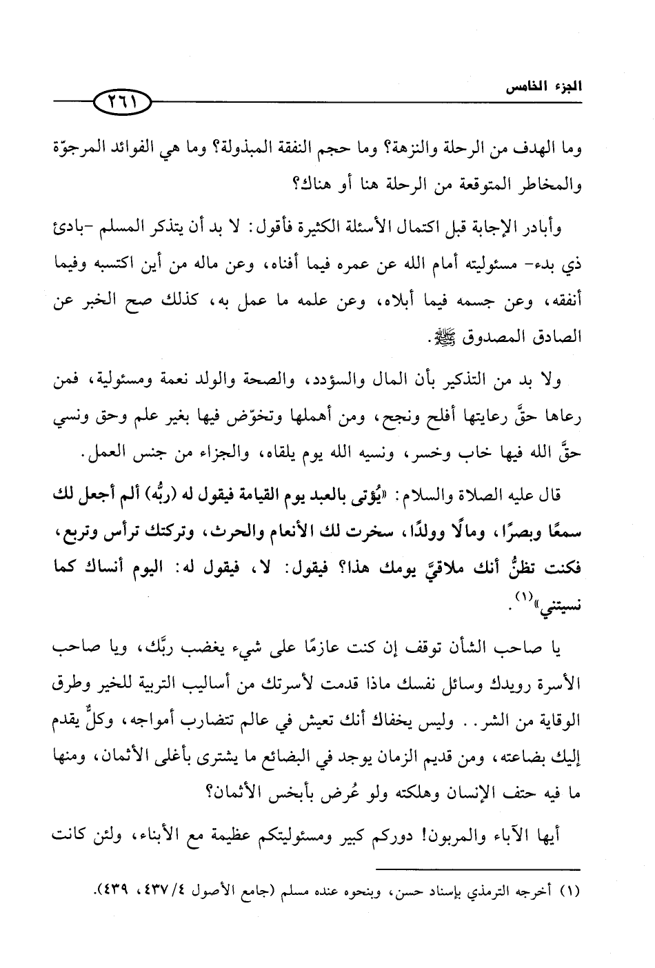 وأبادر الإجابة قبل اكتمال الأسئلة الكثيرة فأقول: لابد أن يتذكر المسلم -بادئ ذي بدء- مسئوليته أمام الله عن عمره فيما أفناه، وعن ماله من أين اكتسبه وفيما أنفقه، وعن جسمه فيما أبلاه، وعن علمه ما عمل به، كذلك صح الخبر عن الصادق المصدوق صلى الله عليه وسلم.