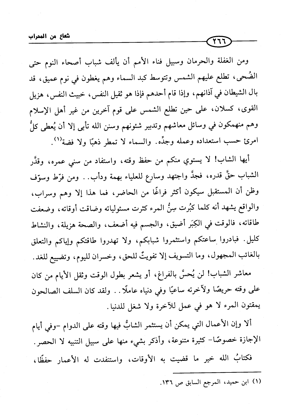 ومن الغفلة والحرمان وسبيل فناء الأمم أن يألف شباب أصحاء النوم حتى الضُحى، تطلع عليهم الشمس وتتوسط كبد السماء وهم يغطون في نوم عميق، قد بال الشيطان في آذانهم، وإذا قام أحدهم فإذا هو ثقيل النفس، خبيث النفس، هزيل القوى، كسلان، على حين تطلع الشمس على قوم آخرين من غير أهل الإسلام وهم منهمكون في وسائل معاشهم وتدبير شئونهم وسنن الله تأبى إلا أن يُعطى كلُّ امرئ حسب استعداده وعمله وجدِّه. والسماء لا تمطر ذهبًا ولا فضة (¬1).