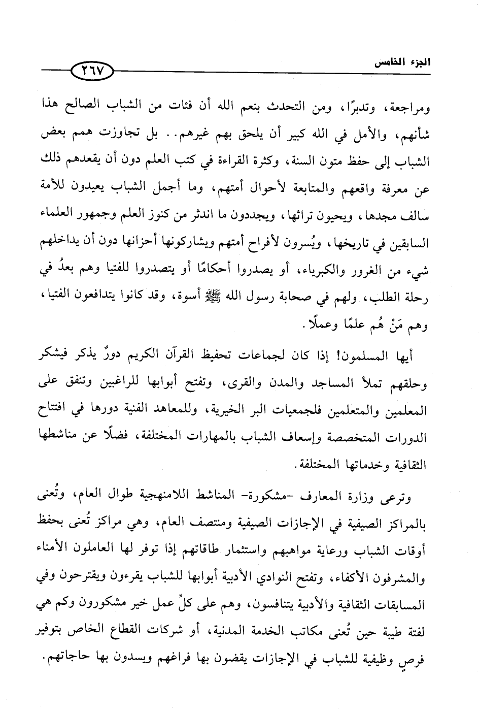 أيها المسلمون! إذا كان لجماعات تحفيظ القرآن الكريم دورٌ يذكر فيشكر وحلقهم تملأ المساجد والمدن والقرى، وتفتح أبوابها للراغبين وتنفق على المعلمين والمتعلمين فلجمعيات البر الخيرية، وللمعاهد الفنية دورها في افتتاح الدورات المتخصصة وإسعاف الشباب بالمهارات المختلفة، فضلًا عن مناشطها الثقافية وخدماتها المختلفة.