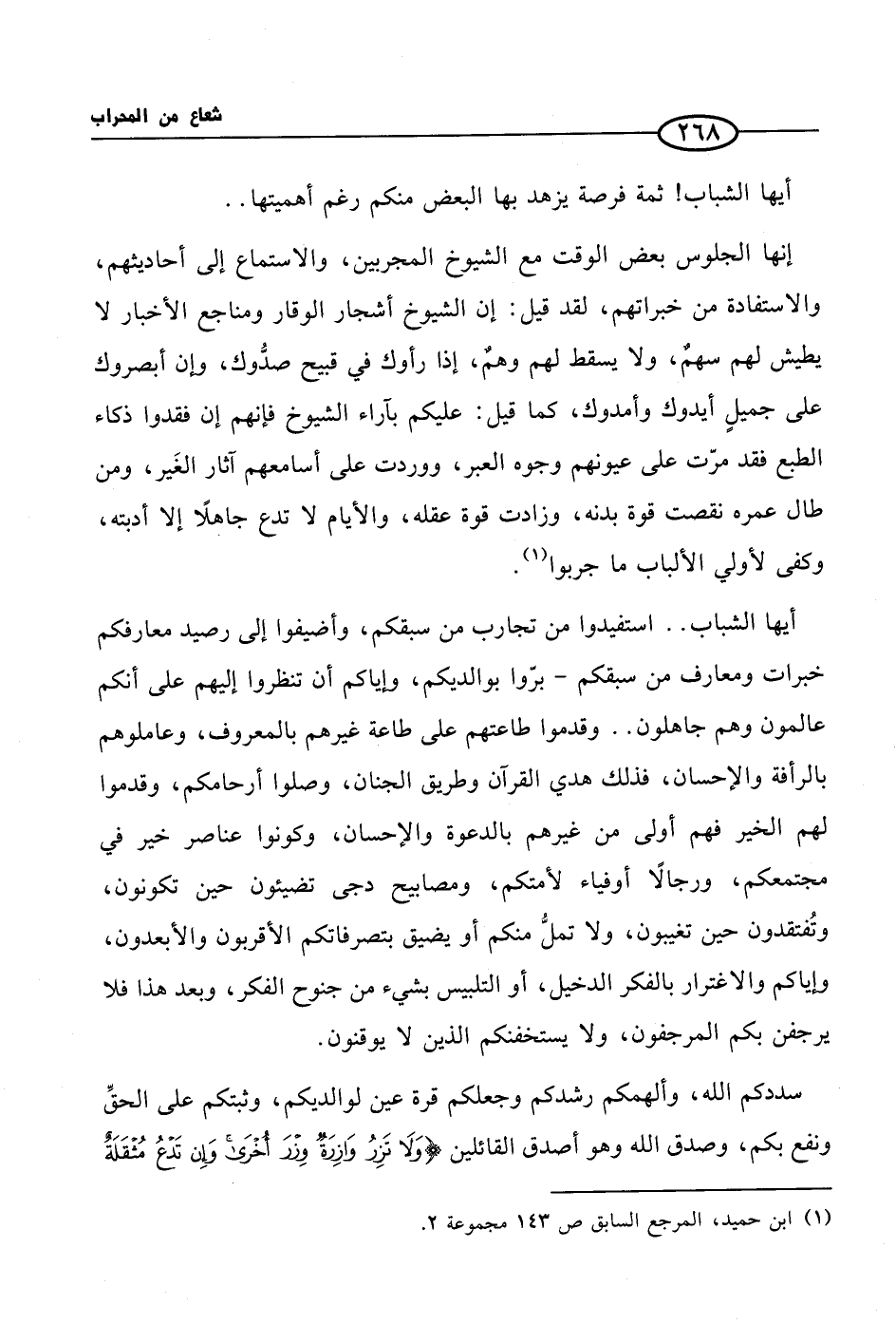 أيها الشباب .. استفيدوا من تجارب من سبقكم، وأضيفوا إلى رصيد معارفكم خبرات ومعارف من سبقكم - برّوا بوالديكم، وإياكم أن تنظروا إليهم على أنكم عالمون وهم جاهلون .. وقدموا طاعتهم على طاعة غيرهم بالمعروف، وعاملوهم بالرأفة والإحسان، فذلك هدي القرآن وطريق الجنان، وصلوا أرحامكم، وقدموا لهم الخير فهم أولى من غيرهم بالدعوة والإحسان، وكونوا عناصر خير في مجتمعكم، ورجالًا أوفياء لأمتكم، ومصابيح دجى تضيئون حين تكونون، وتُفتقدون حين تغيبون، ولا تملُّ منكم أو يضيق بتصرفاتكم الأقربون والأبعدون، وإياكم والاغترار بالفكر الدخيل، أو التلبيس بشيء من جنوح الفكر، وبعد هذا فلا يرجفن بكم المرجفون، ولا يستخفنكم الذين لا يوقنون.
