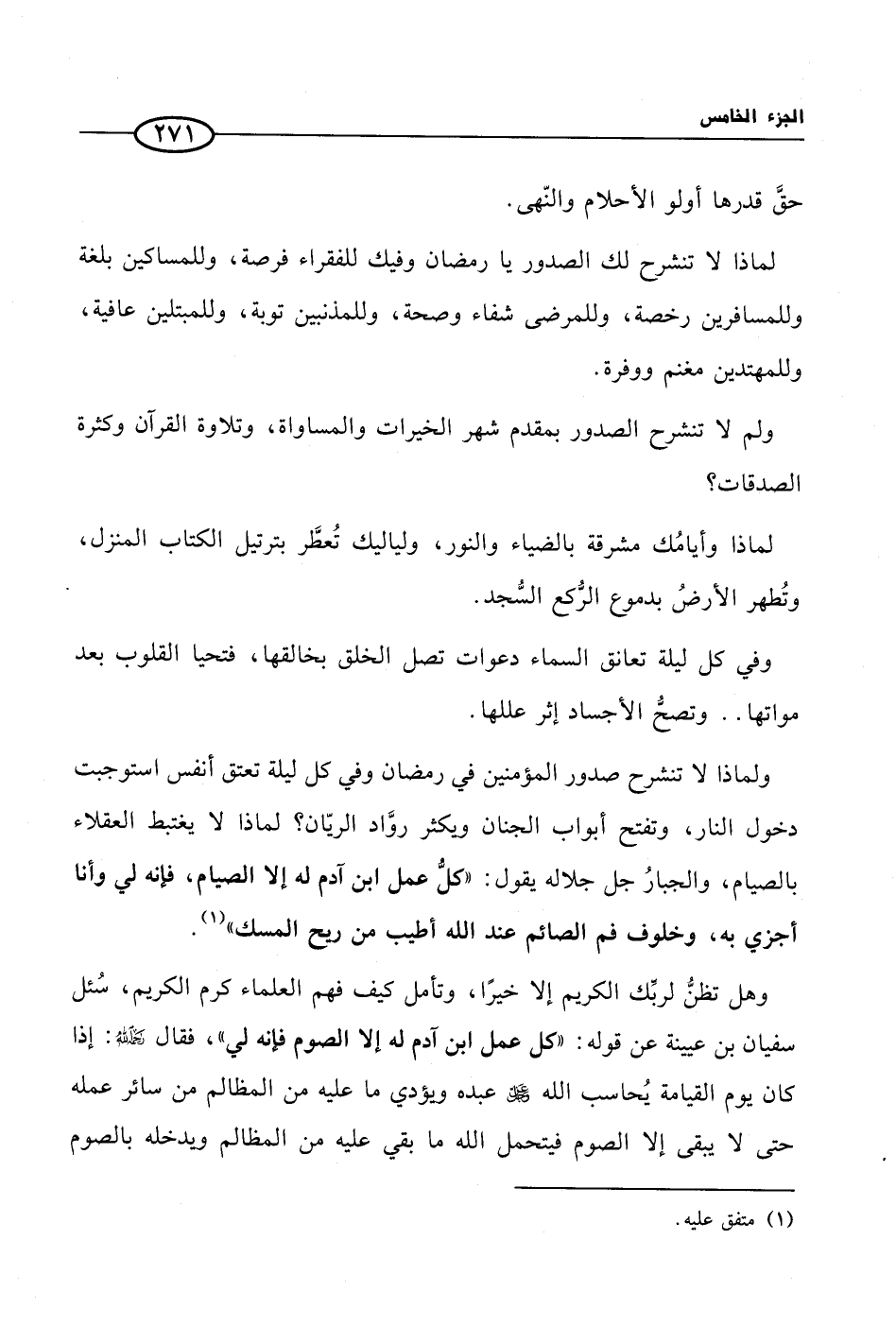ولماذا لا تنشرح صدور المؤمنين في رمضان وفي كل ليلة تعتق أنفس استوجبت دخول النار، وتفتح أبواب الجنان ويكثر روَّاد الريّان؟ لماذا لا يغتبط العقلاء بالصيام، والجبارُ جل جلاله يقول: ((كلُّ عمل ابن آدم له إلا الصيام، فإنه لي وأنا أجزي به، وخلوف فم الصائم عند الله أطيب من ريح المسك)) (¬1).