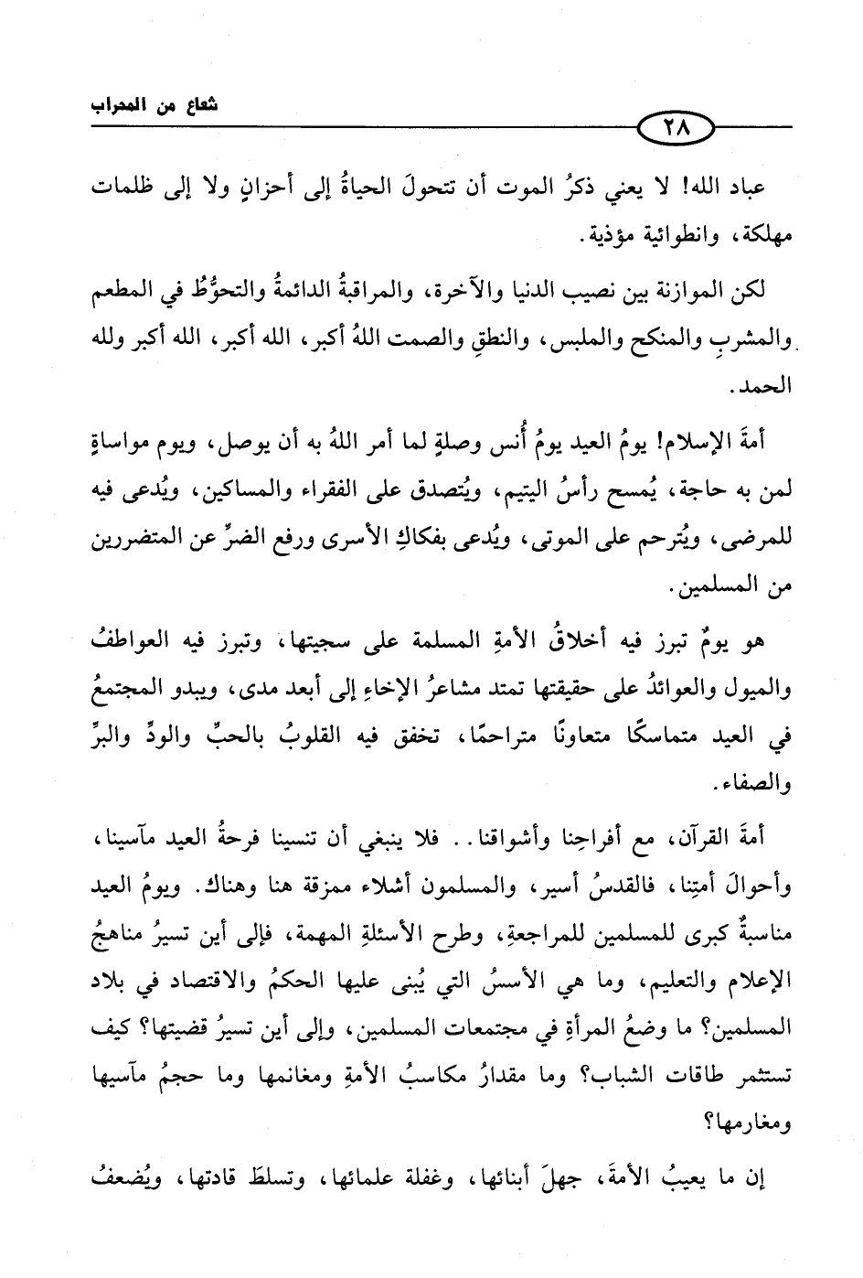 أمةَ القرآن، مع أفراحِنا وأشواقنا .. فلا ينبغي أن تنسينا فرحةُ العيد مآسينا، وأحوالَ أمتِنا، فالقدسُ أسير، والمسلمون أشلاء ممزقة هنا وهناك. ويومُ العيد مناسبةٌ كبرى للمسلمين للمراجعةِ، وطرح الأسئلةِ المهمة، فإلى أين تسيرُ مناهجُ الإعلام والتعليم، وما هي الأسسُ التي يُبنى عليها الحكمُ والاقتصاد في بلاد المسلمين؟ ما وضعُ المرأةِ في مجتمعات المسلمين، وإلى أين تسيرُ قضيتها؟ كيف تستثمر طاقات الشباب؟ وما مقدارُ مكاسبُ الأمةِ ومغانمها وما حجمُ مآسيها ومغارمها؟