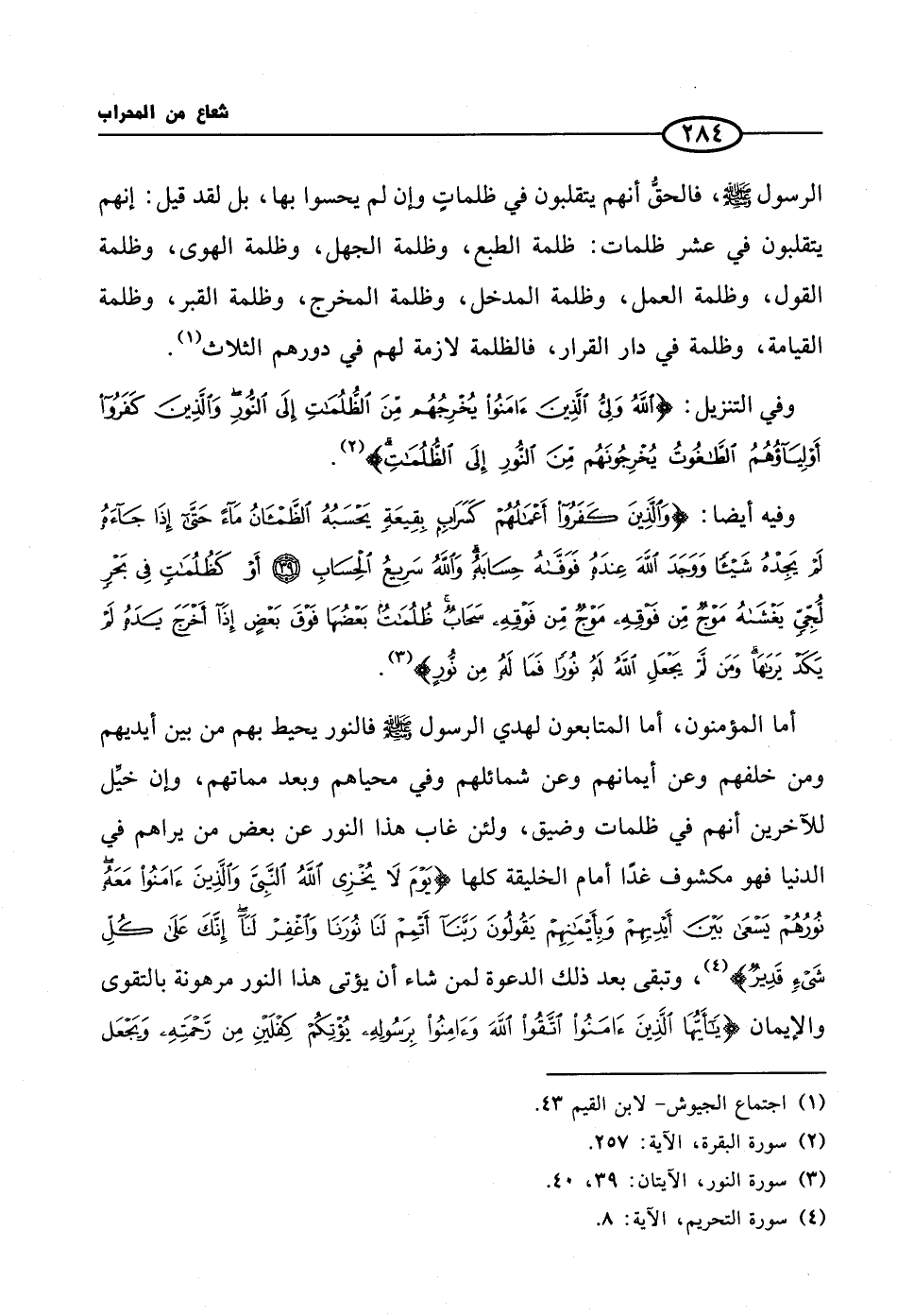 وفي التنزيل: {الله ولي الذين آمنوا يخرجهم من الظلمات إلى النور والذين كفروا أولياؤهم الطاغوت يخرجونهم من النور إلى الظلمات} (¬2). وفيه أيضا: {والذين كفروا أعمالهم كسراب بقيعة يحسبه الظمان ماء حتى إذا جاءه لم يجده شيئا ووجد الله عنده فوفاه حسابه والله سريع الحساب * أو كظلمات في بحر لجي يغشاه موج من فوقه موج من فوقه سحاب ظلمات بعضها فوق بعض إذا أخرج يده لم يكد يراها ومن لم يجعل الله له نورا فما له من نور} (¬3).