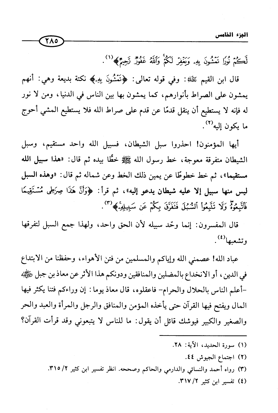 أيها المؤمنون! احذروا سبل الشيطان، فسبيل الله واحد مستقيم، وسبل الشيطان متفرقة معوجة، خط رسول الله صلى الله عليه وسلم خطا بيده ثم قال: ((هذا سبيل الله مستقيما))، ثم خط خطوطا عن يمين ذلك الخط وعن شماله ثم قال: ((وهذه السبل ليس منها سبيل إلا عليه شيطان يدعو إليه))، ثم قرأ {وأن هذا صراطي مستقيما فاتبعوه ولا تتبعوا السل فتفرق بكم عن سبيله} (¬3).