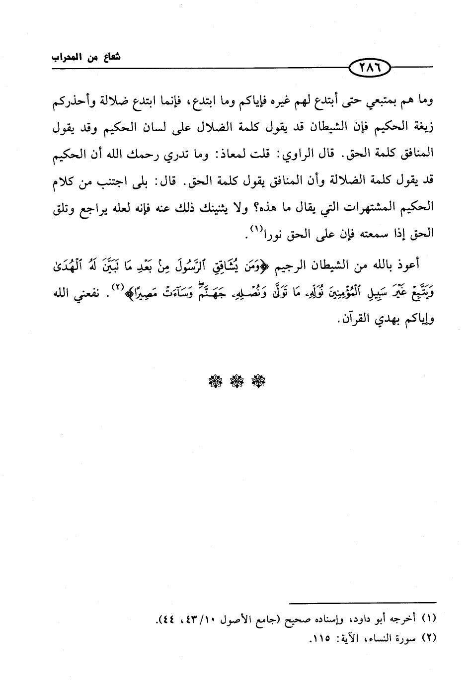 وما هم بمتبعي حتى أبتدع لهم غيره فإياكم وما ابتدع، فإنما ابتدع ضلالة وأحذركم زيغة الحكيم فإن الشيطان قد يقول كلمة الضلال على لسان الحكيم وقد يقول المنافق كلمة الحق. قال الراوي: قلت لمعاذ: وما تدري رحمك الله أن الحكيم قد يقول كلمة الضلالة وأن المنافق يقول كلمة الحق. قال: بلى اجتنب من كلام الحكيم المشتهرات التي يقال ما هذه؟ ولا يثنينك ذلك عنه فإنه لعله يراجع وتلق الحق إذا سمعته فإن على الحق نورا (¬1).
