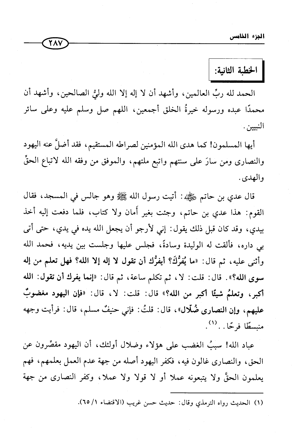 قال عدي بن حاتم رضي الله عنه: أتيت رسول الله صلى الله عليه وسلم وهو جالس في المسجد، فقال القوم: هذا عدي بن حاتم، وجئت بغير أَمان ولا كتاب، فلما دفعت إليه أخذ بيدي، وقد كان قبل ذلك يقول: إني لأرجو أن يجعل الله يده في يدي، حتى أتى بي داره، فألقت له الوليدة وسادةً، فجلس عليها وجلست بين يديه، فحمد الله وأثنى عليه، ثم قال: ((ما يُفرُّكَ؟ أيفرُّك أن تقول لا إله إلا الله؟ فهل تعلم من إله سوى الله؟ )). قال: قلت: لا، ثم تكلم ساعة، ثم قال: ((إنما يفرك أن تقول: الله أكبر، وتعلمُ شيئًا أكبر من الله؟ )) قال: قلت: لا، قال: ((فإن اليهود مغضوبٌ عليهم، وإن النصارى ضُلّال))، قال: قلتُ: فإني حنيفٌ مسلم، قال: فرأيت وجهه منبسطًا فرحًا .. (¬1).