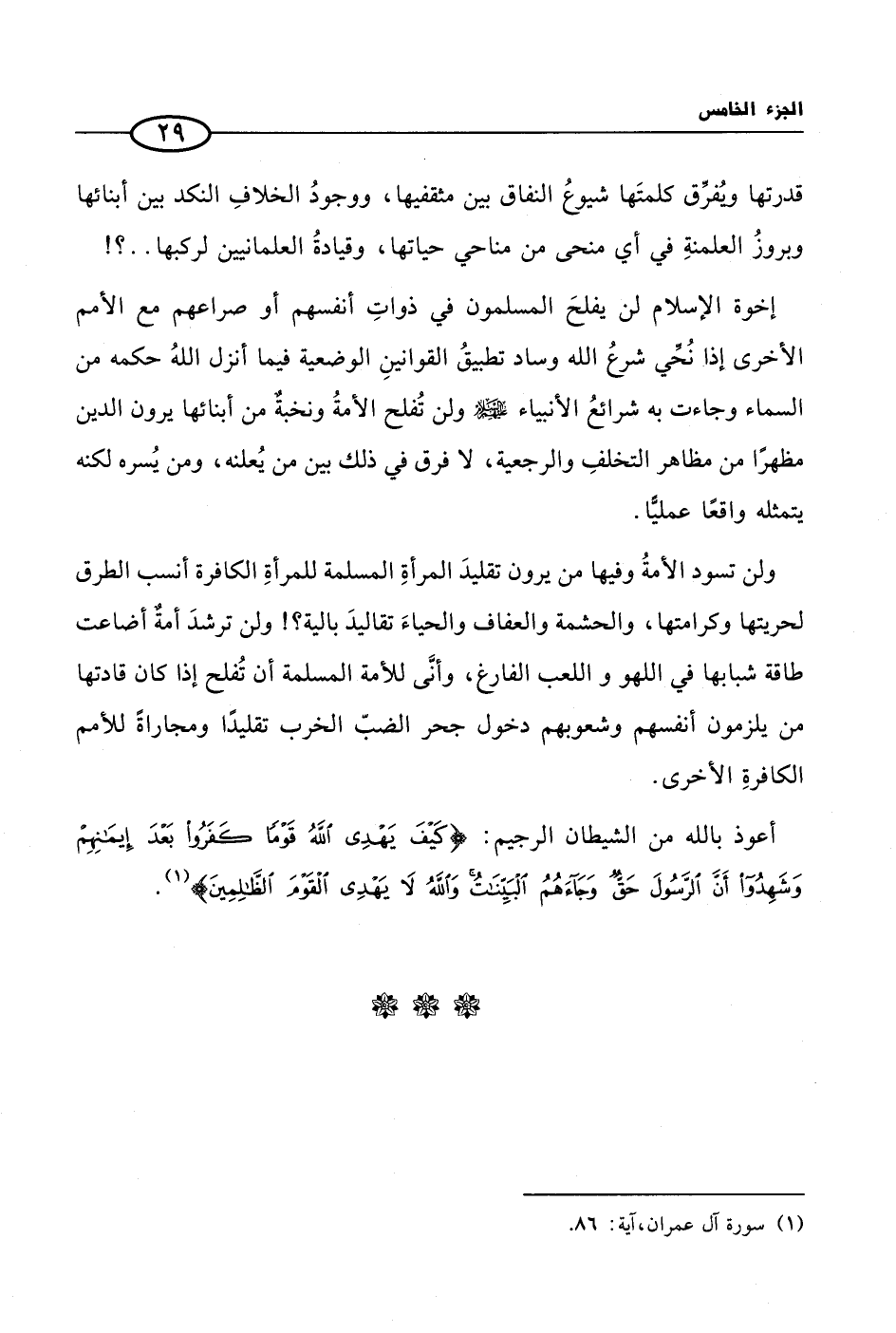 قدرتها ويُفرِّق كلمتَها شيوعُ النفاق بين مثقفيها، ووجودُ الخلافِ النكد بين أبنائها وبروزُ العلمنةِ في أي منحى من مناحي حياتها، وقيادةُ العلمانيين لركبها .. ؟ !