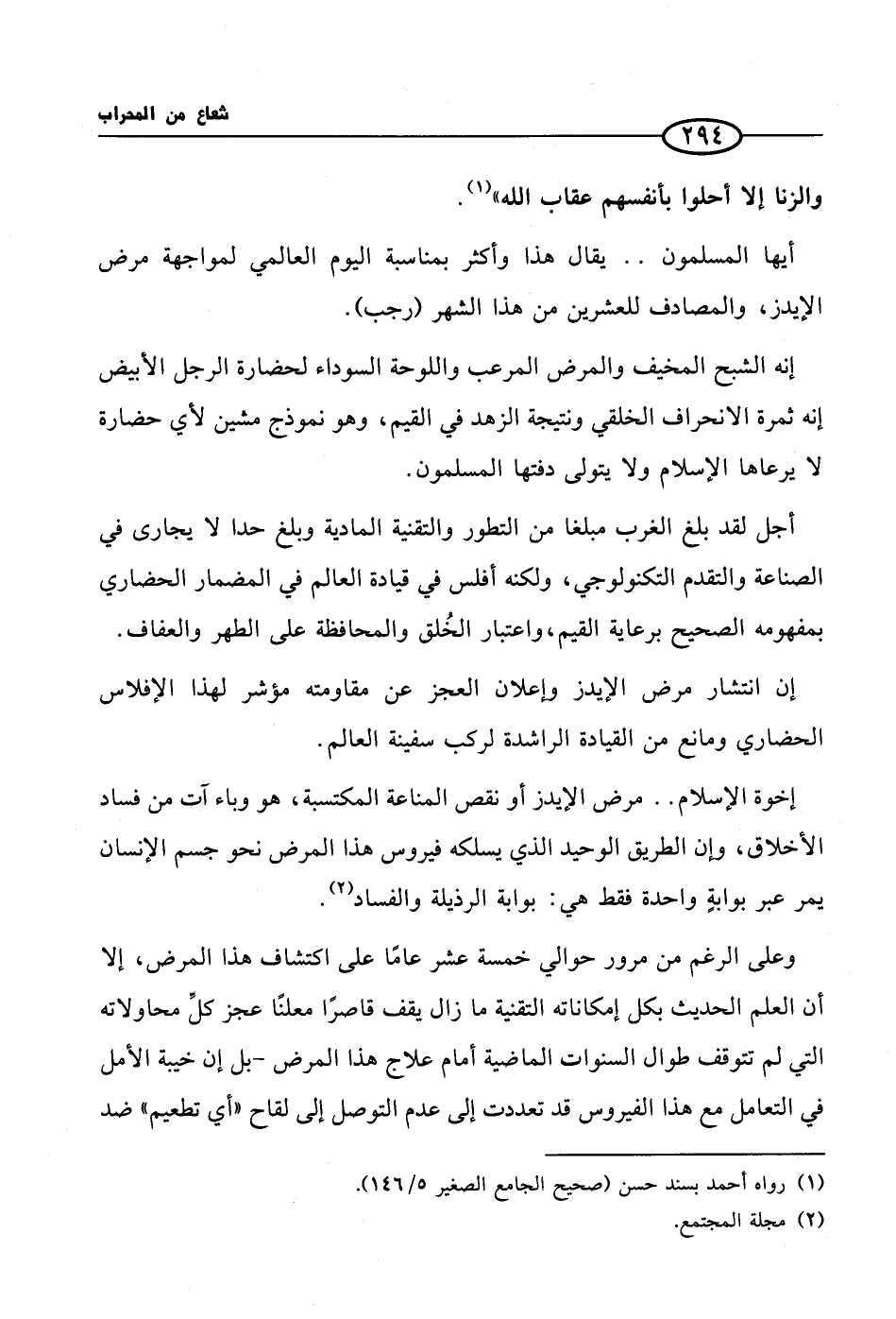إخوة الإسلام .. مرض الإيدز أو نقص المناعة المكتسبة، هو وباء آت من فساد الأخلاق، وإن الطريق الوحيد الذي يسلكه فيروس هذا المرض نحو جسم الإنسان يمر عبر بوابةٍ واحدة فقط هي: بوابة الرذيلة والفساد (¬2).