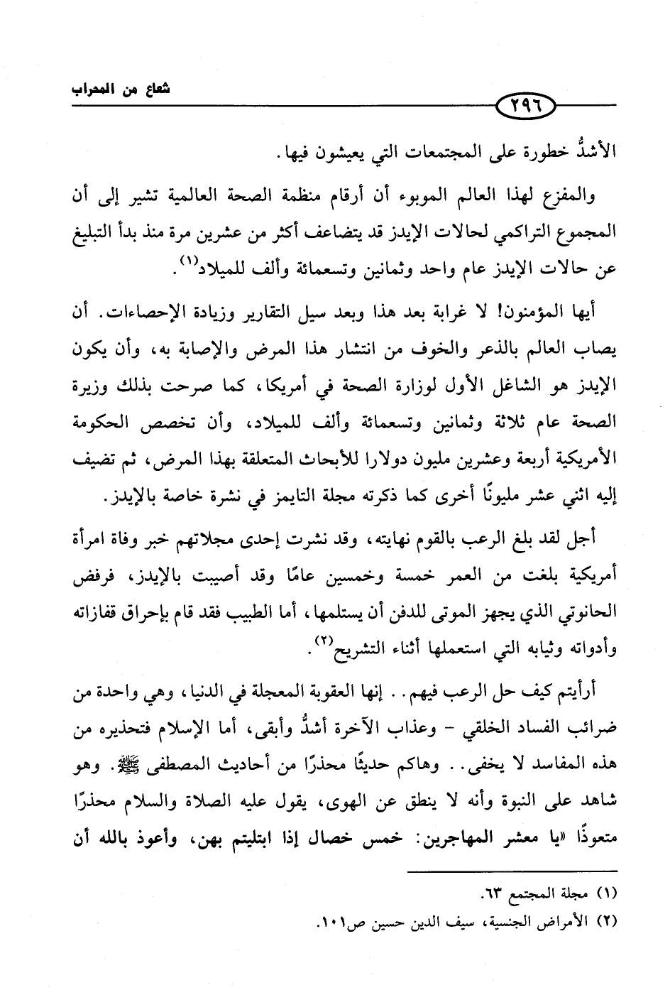أرأيتم كيف حل الرعب فيهم .. إنها العقوبة المعجلة في الدنيا، وهي واحدة من ضرائب الفساد الخلقي - وعذاب الآخرة أشدُّ وأبقى، أما الإسلام فتحذيره من هذه المفاسد لا يخفى .. وهاكم حديثًا محذرًا من أحاديث المصطفى صلى الله عليه وسلم. وهو شاهد على النبوة وأنه لا ينطق عن الهوى، يقول عليه الصلاة والسلام محذرًا متعوذًا ((يا معشر المهاجرين: خمس خصال إذا ابتليتم بهن، وأعوذ بالله أن
