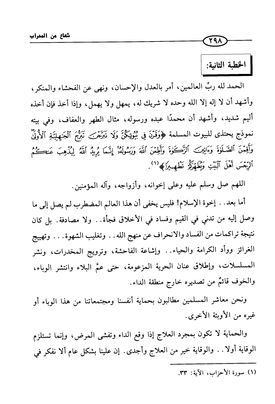الحمد لله ربِّ العالمين، أمر بالعدل والإحسان، ونهى عن الفحشاء والمنكر، وأشهد أن لا إله إلا الله وحده لا شريك له، يمهل ولا يهمل، وإذا أخذ فإن أخذه أليم شديد، وأشهد أن محمدًا عبده ورسوله، مثال الطهر والعفاف، وفي بيته نموذج يحتذى للبيوت المسلمة {وقرن في بيوتكن ولا تبرجن تبرج الجاهلية الأولى وأقمن الصلاة وآتين الزكاة وأطعن الله ورسوله إنما يريد الله ليذهب عنكم الرجس أهل البيت ويطهركم تطهيرا} (¬1).