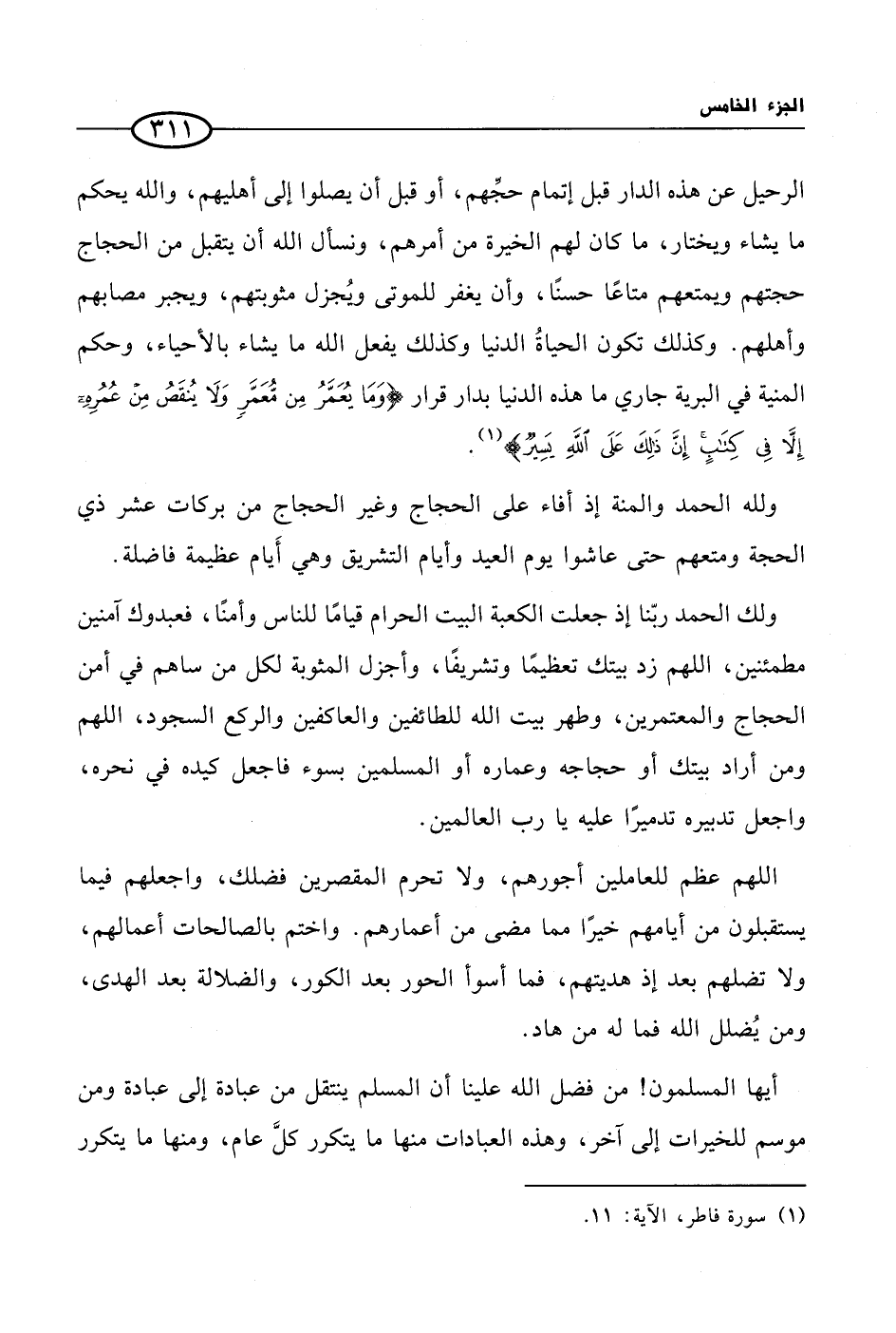 الرحيل عن هذه الدار قبل إتمام حجِّهم، أو قبل أن يصلوا إلى أهليهم، والله يحكم ما يشاء ويختار، ما كان لهم الخيرة من أمرهم، ونسأل الله أن يتقبل من الحجاج حجتهم ويمتعهم متاعًا حسنًا، وأن يغفر للموتى ويُجزل مثوبتهم، ويجبر مصابهم وأهلهم. وكذلك تكون الحياةُ الدنيا وكذلك يفعل الله ما يشاء بالأحياء، وحكم المنية في البرية جاري ما هذه الدنيا بدار قرار {وما يعمر من معمر ولا ينقص من عمره إلا في كتاب إن ذلك على الله يسير} (¬1).