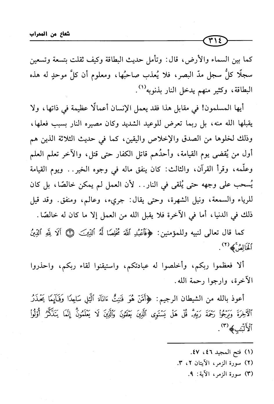 أعوذ بالله من الشيطان الرجيم: {أممن هو قانت آناء الليل ساجدا وقائما يحذر الآخرة ويرجو رحمة ربه قل هل يستوي الذين يعلمون والذين لا يعلمون إنما يتذكر أولو الألباب} (¬3).