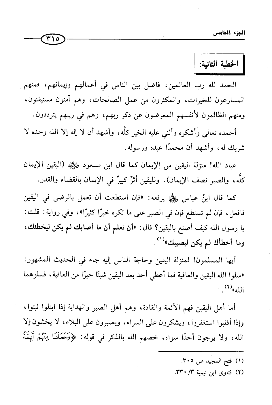 عباد الله! منزلة اليقين من الإيمان كما قال ابن مسعود رضي الله عنه (اليقين الإيمان كلُّه، والصبر نصف الإيمان). ولليقين أثرٌ كبيرٌ في الإيمان بالقضاء والقدر. كما قال ابنُ عباس رضي الله عنهما يرفعه: ((فإن استطعت أن تعمل بالرضى في اليقين فافعل، فإن لم تستطع فإن في الصبر على ما تكره خيرًا كثيرًا))، وفي رواية: قلت: يا رسول الله كيف أصنع باليقين؟ قال: ((أن تعلم أن ما أصابك لم يكن ليخطئك، وما أخطأك لم يكن ليصيبك)) (¬1).