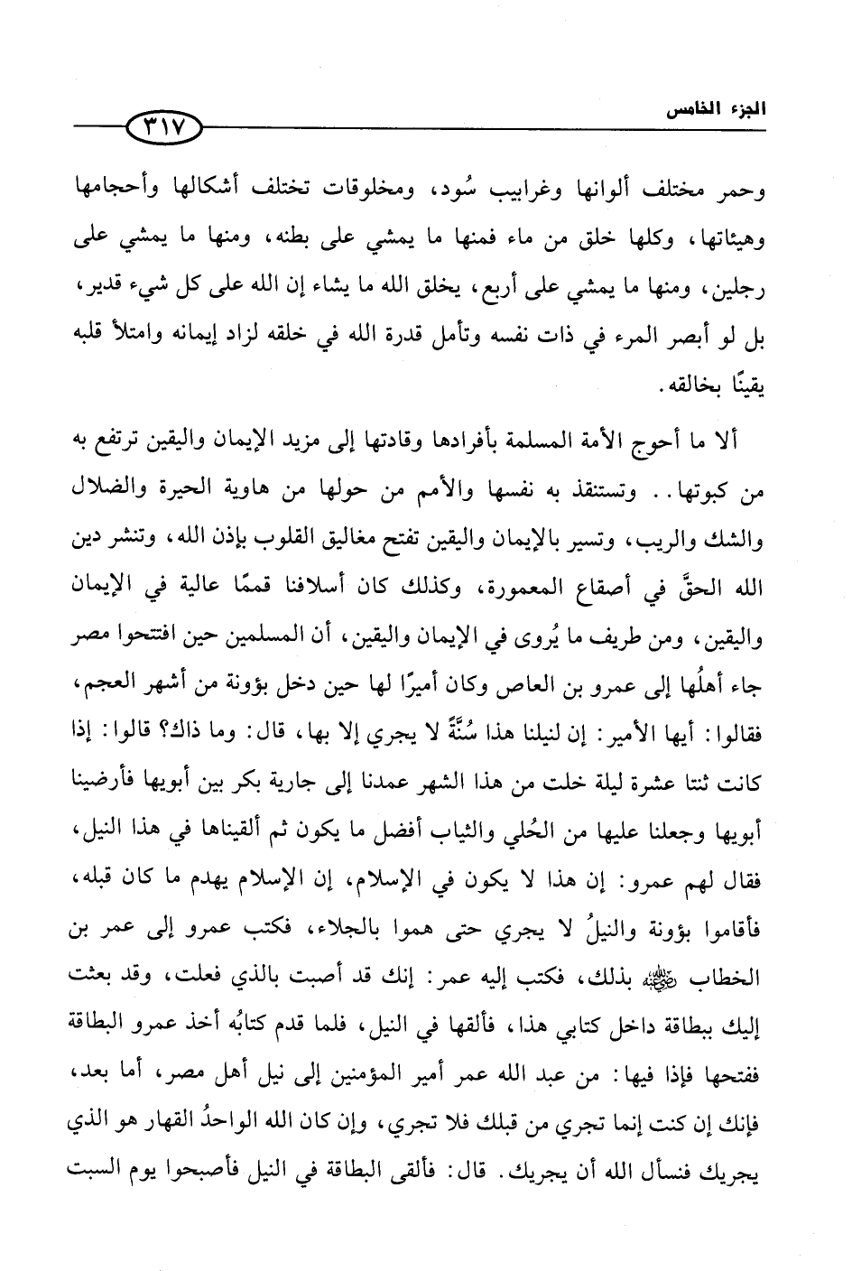 ألا ما أحوج الأمة المسلمة بأفرادها وقادتها إلى مزيد الإيمان واليقين ترتفع به من كبوتها .. وتستنقذ به نفسها والأمم من حولها من هاوية الحيرة والضلال والشك والريب، وتسير بالإيمان واليقين تفتح مغاليق القلوب بإذن الله، وتنشر دين الله الحقَّ في أصقاع المعمورة، وكذلك كان أسلافنا قممًا عالية في الإيمان واليقين، ومن طريف ما يُروى في الإيمان واليقين، أن المسلمين حين افتتحوا مصر جاء أهلُها إلى عمرو بن العاص وكان أميرًا لها حين دخل بؤونة من أشهر العجم، فقالوا: أيها الأمير: إن لنيلنا هذا سُنَّةً لا يجري إلا بها، قال: وما ذاك؟ قالوا: إذا كانت ثنتا عشرة ليلة خلت من هذا الشهر عمدنا إلى جارية بكر بين أبويها فأرضينا أبويها وجعلنا عليها من الحُلي والثياب أفضل ما يكون ثم ألقيناها في هذا النيل، فقال لهم عمرو: إن هذا لا يكون في الإسلام، إن الإسلام يهدم ما كان قبله، فأقاموا بؤونة والنيلُ لا يجري حتى هموا بالجلاء، فكتب عمرو إلى عمر بن الخطاب رضي الله عنه بذلك، فكتب إليه عمر: إنك قد أصبت بالذي فعلت، وقد بعثت إليك ببطاقة داخل كتابي هذا، فألقها في النيل، فلما قدم كتابُه أخذ عمرو البطاقة ففتحها فإذا فيها: من عبد الله عمر أمير المؤمنين إلى نيل أهل مصر، أما بعد، فإنك إن كنت إنما تجري من قبلك فلا تجري، وإن كان الله الواحدُ القهار هو الذي يجريك فنسأل الله أن يجريك. قال: فألقى البطاقة في النيل فأصبحوا يوم السبت