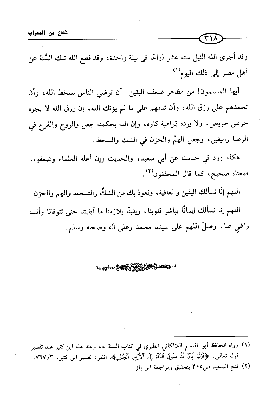 وقد أجرى الله النيل ستة عشر ذراعًا في ليلة واحدة، وقد قطع الله تلك السُّنة عن أهل مصر إلى ذلك اليوم (¬1).