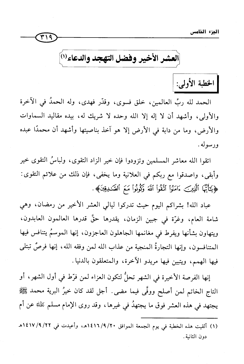 (¬1) ألقيت هذه الخطبة في يوم الجمعة الموافق 20/ 9/ 1416 هـ، وأعيدت في 22/ 9/ 1417 هـ دون الثانية.