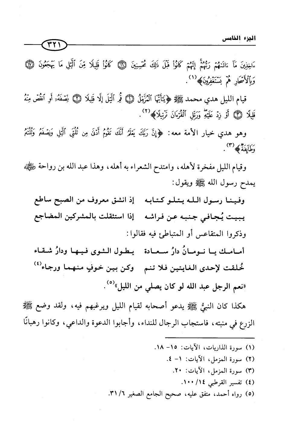 وقيام الليل مفخرة لأهله، وامتدح الشعراء به أهله، وهذا عبد الله بن رواحة رضي الله عنه يمدح رسول الله صلى الله عليه وسلم ويقول: