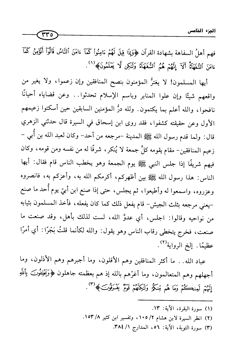 أيها المسلمون! لا يغترُّ المؤمنون بنصح المنافقين وإن زعموا، ولا يغير من واقعهم شيئا وإن علوا المنابر وباسم الإسلام تحدثوا .. وعن قضاياه أحيانًا نافحوا، والله أعلم بما يكتمون. ولله درُّ المؤمنين السابقين حين أسكتوا زعيمهم الأول وعن حقيقته كشفوا، فقد روى ابن إسحاق في السيرة قال حدثني الزهري قال: ولما قدم رسول الله صلى الله عليه وسلم المدينة -مرجعه من أحد- وكان لعبد الله بن أُبي -زعيم المنافقين- مقام يقومه كلَّ جمعة لا يُنكر، شرفًا له من نفسه ومن قومه، وكان فيهم شريفًا إذا جلس النبي صلى الله عليه وسلم يوم الجمعة وهو يخطب الناس قام فقال: أيها الناس: هذا رسول الله صلى الله عليه وسلم بين أظهركم، أكرمكم الله به، وأعزكم به، فانصروه وعزروه، واسمعوا له وأطيعوا، ثم يجلس، حتى إذا صنع ابن أبيّ يوم أحد ما صنع -يعني مرجعه بثلث الجيش- قام يفعل ذلك كما كان يفعله، فأخذ المسلمون بثيابه من نواحيه وقالوا: اجلس، أي عدوَّ الله، لست لذلك بأهل، وقد صنعت ما صنعت، فخرج يتخطى رقاب الناس وهو يقول: والله لكأنما قلتُ بَجْرًا: أي أمرًا عظيمًا. إلخ الرواية (¬2).